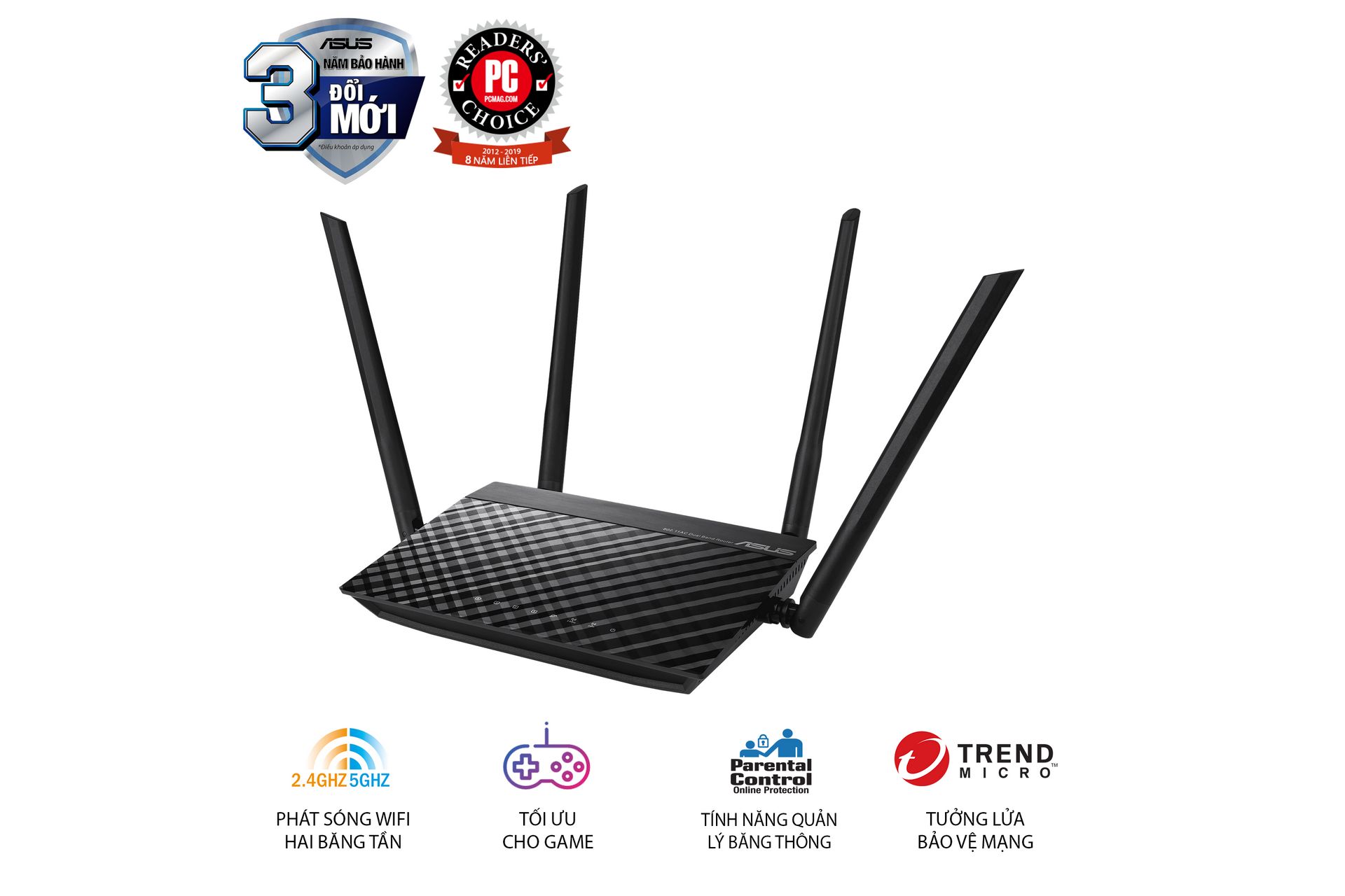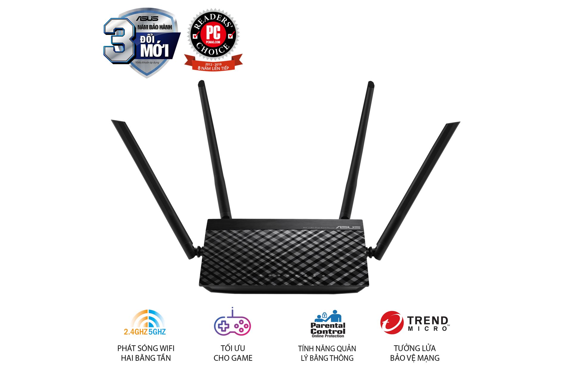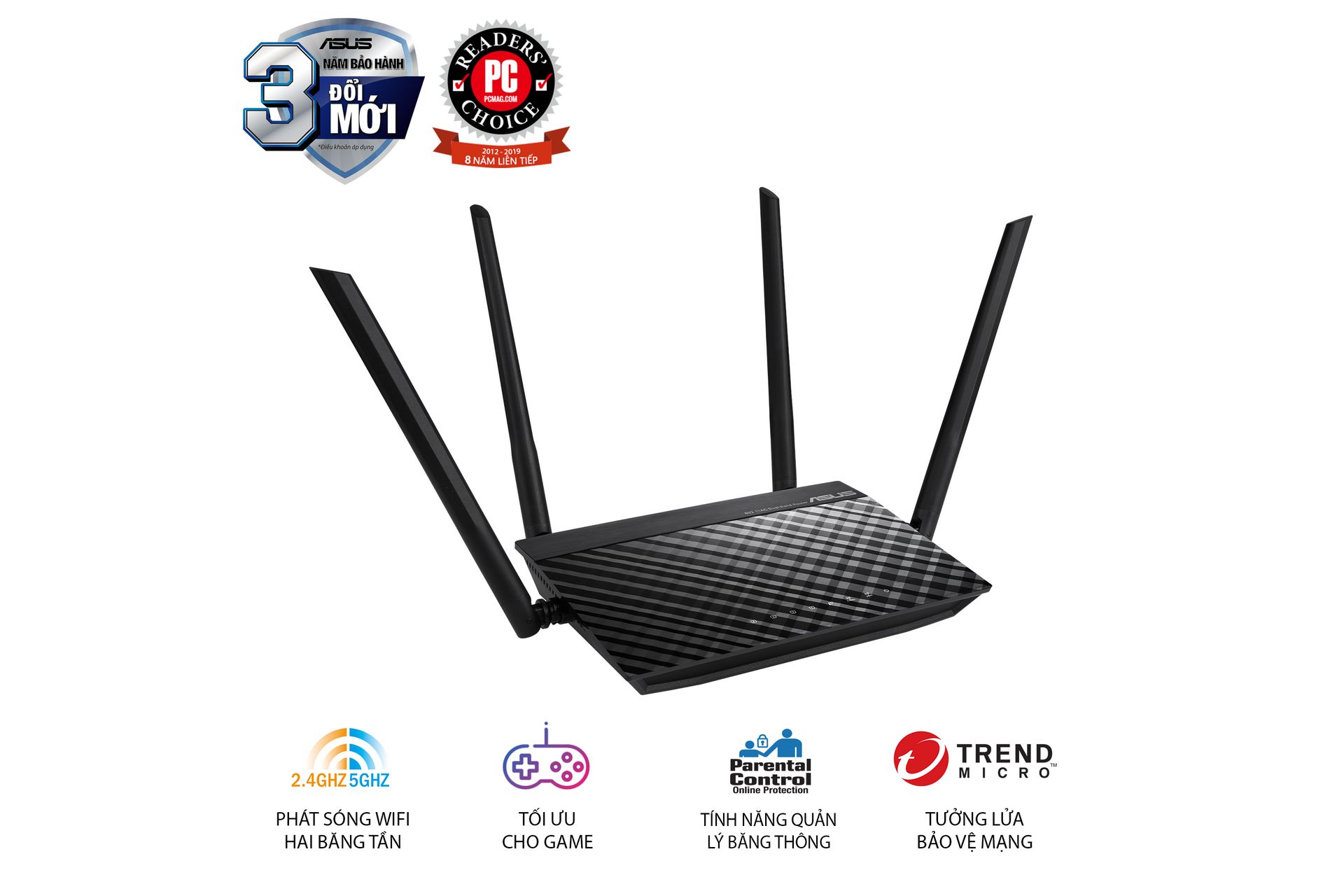 ASUS RT-AC1200 V2 là bộ định tuyến Wi-Fi băng tần kép AC1200 với bốn ăng-ten và chức năng kiểm soát dành cho cha mẹ.