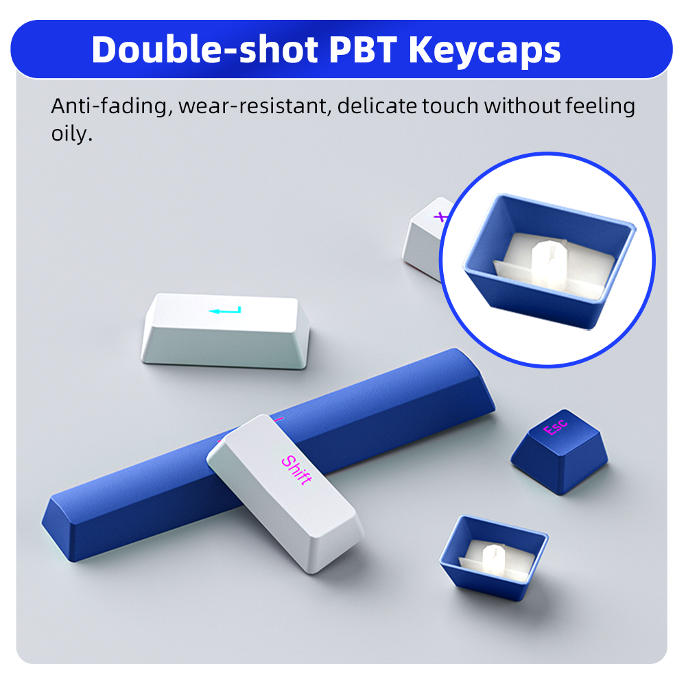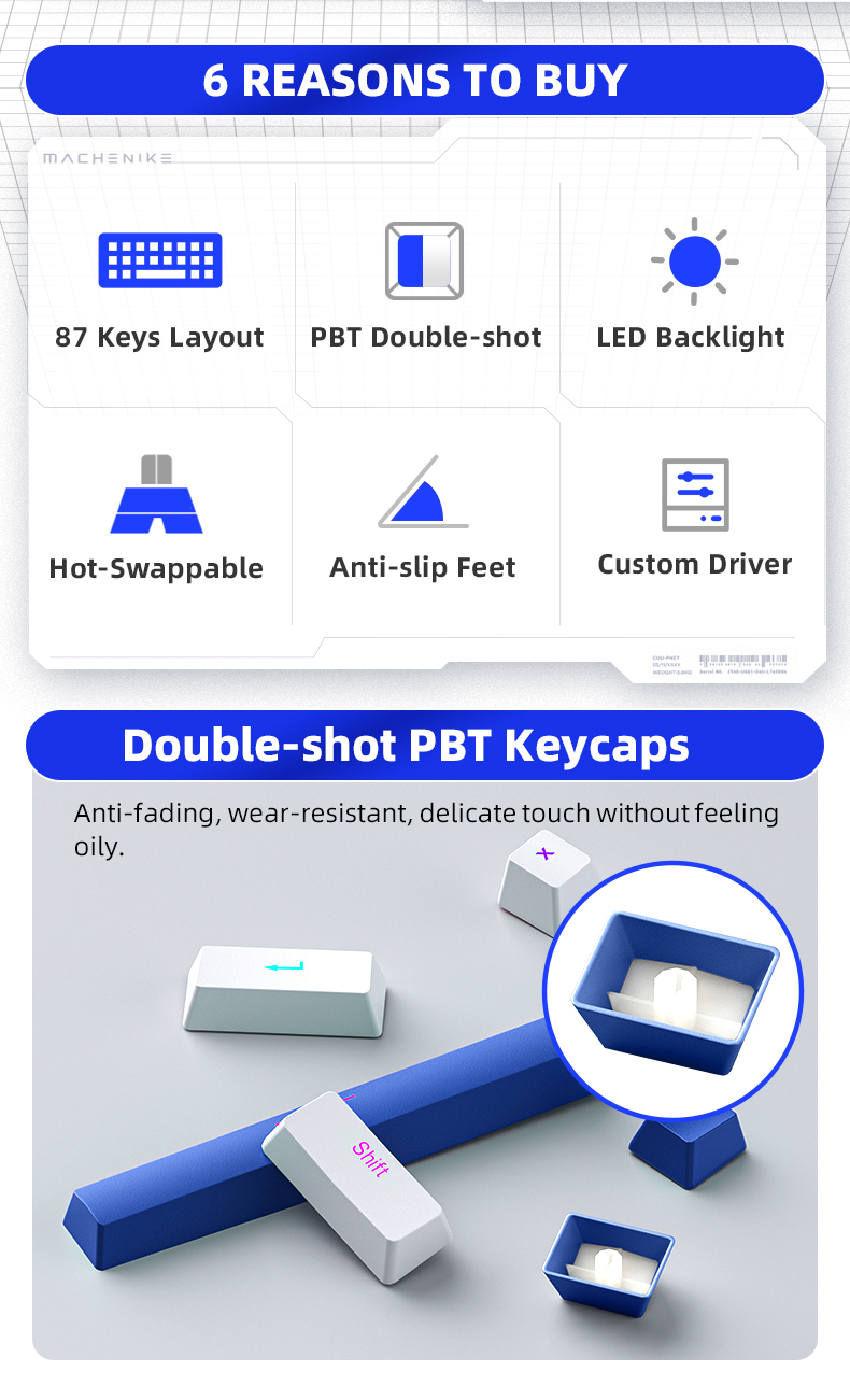 | Thông tin nổi bật | Phương thức kết nối: Có dây Kích thước: 359.7*129.7*36mm - Trọng lượng 625g Màu sắc: White Blue Số phím: 87 phím Switch: (Outemu) Red/Blue Có hỗ trợ Hot-swap (3-Pin) Keycaps: Double-shot PBT Mixed light effect hỗ trợ 11 kiểu LED Cáp USB-C có thể tháo rời 100% Anti-ghosting và N-key rollcover Tương thích: PC/Laptop/MacOS |
