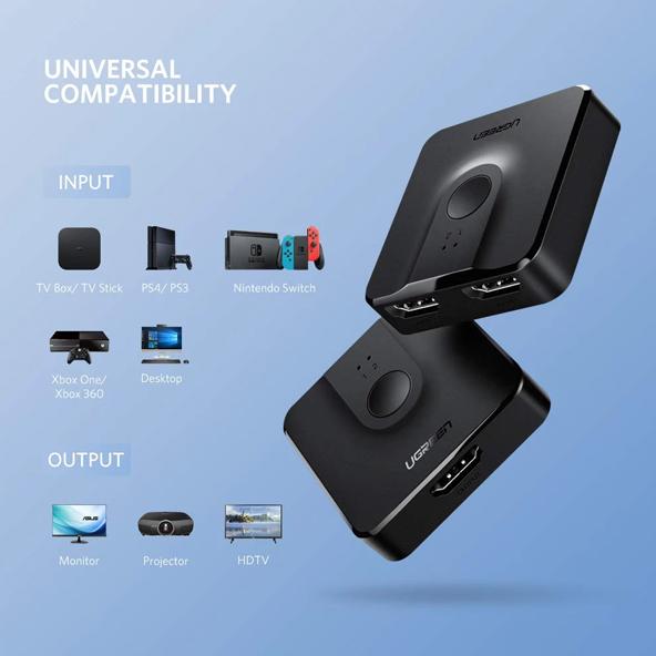 - Bộ chia HDMI 2 cổng hỗ trợ 2 chiều Ugreen 50966 hỗ trợ độ phân giải lên đến 4K 30hz tuân thủ HDCP 1.4, lý tưởng để kết nối TV Skybox, Apple TV, DVD, PS4, XBOX, Blue-Ray Player, TV Stick và chia tín hiệu HDMI cho HDTV / Máy Chiếu / Màn Hình và các thiết bị trình chiếu khác của bạn. Thiết bị tự động nhận diện và điều chỉnh độ phân giải giúp bạn dễ dàng cắm là nhận mà không cần cài đặt.