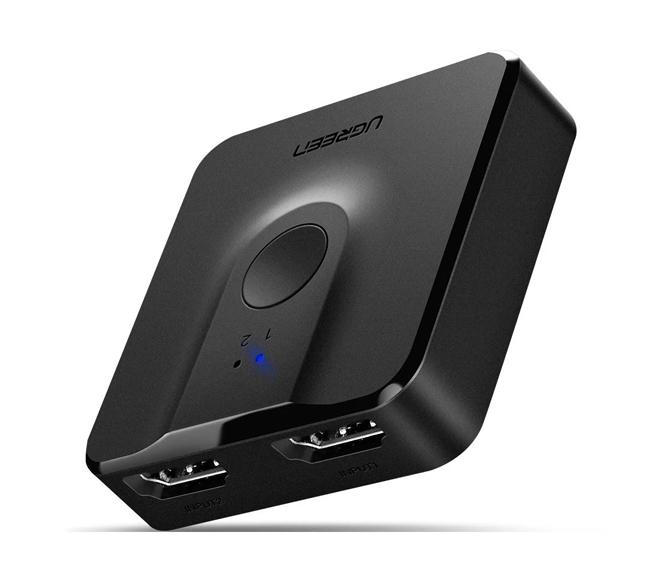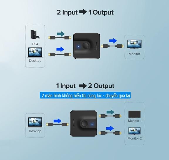 - Ugreen 50966 cũng có thể hoạt động như một bộ chia HDMI, cho phép bạn kết nối thiết bị chính của mình với 2 TV, màn hình hoặc máy chiếu khi bạn cắm các thiết bị này vào cổng input trên thiết bị, cổng còn lại cắm vào thiết bị phát. Bạn có thể chuyển đổi giữa 2 màn hình, lựa chọn màn hình hiển thị, chỉ có 1 màn hình hiển thị cho video đầu ra, không hiển thị cùng lúc 2 màn hình được.