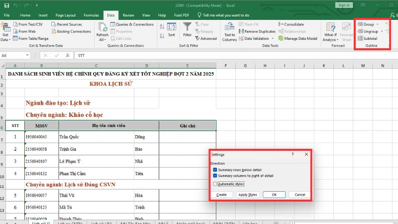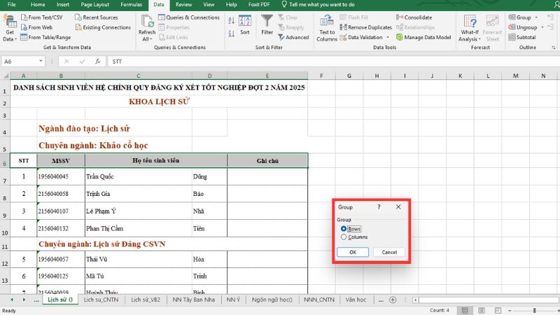 Cách này không ẩn cột hoàn toàn mà nhóm chúng lại. Nó cực kỳ hữu ích khi bạn làm báo cáo và muốn người xem có thể chủ động xem (hoặc ẩn) các cột chi tiết.