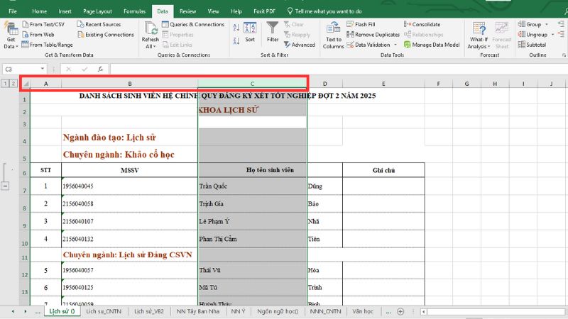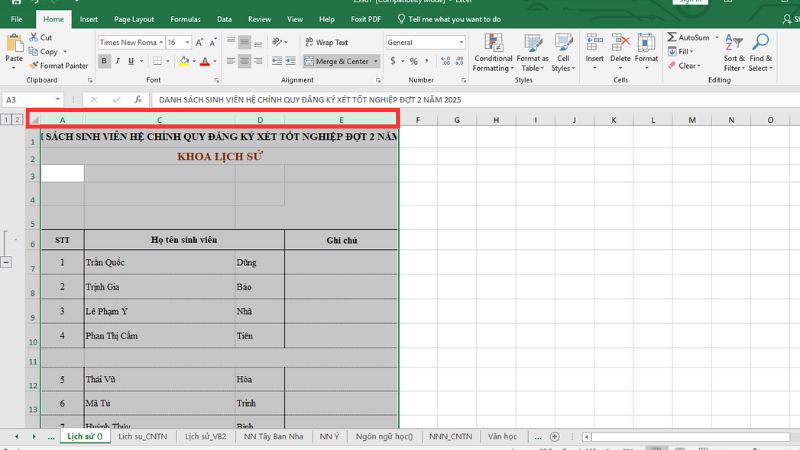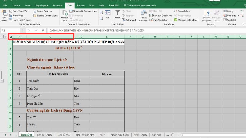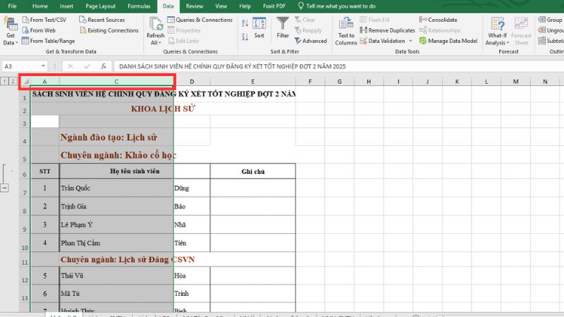 Chọn 1 cột: Nhấp chuột vào tiêu đề cột (ví dụ: chữ A, B, C).