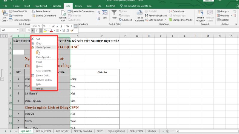 Chọn Unhide Columns (Hiện Cột).