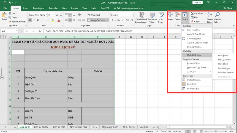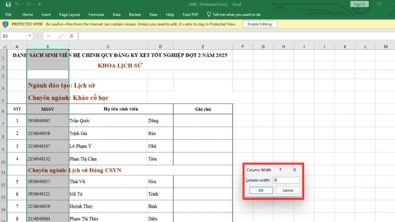 Ngay lập tức, các cột được chọn sẽ bị ẩn đi.