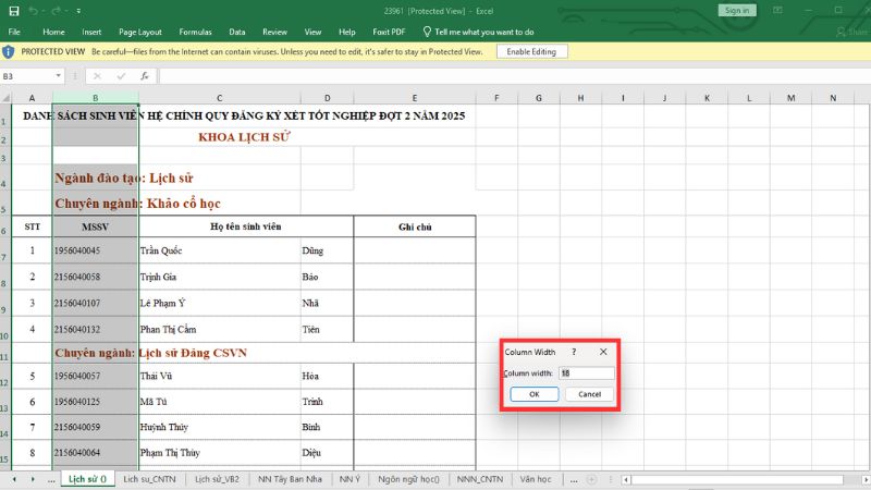 Thao tác này sẽ hiện tất cả các cột đang bị ẩn trên toàn bộ trang tính đó.