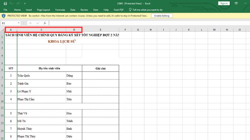 Ngay lập tức, cột C (và bất kỳ cột nào khác bị ẩn giữa B và D) sẽ xuất hiện trở lại.