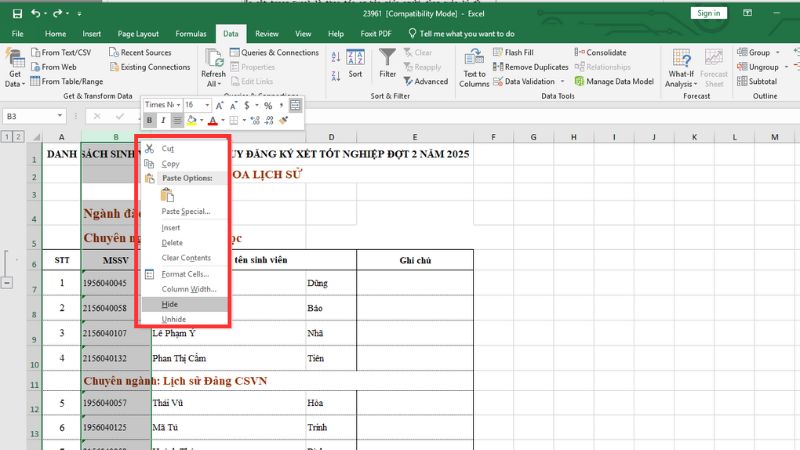 Nhấp chuột phải: Nhấp chuột phải vào bất kỳ đâu trên vùng tiêu đề cột đã được bôi đen (chỗ chữ B, D).