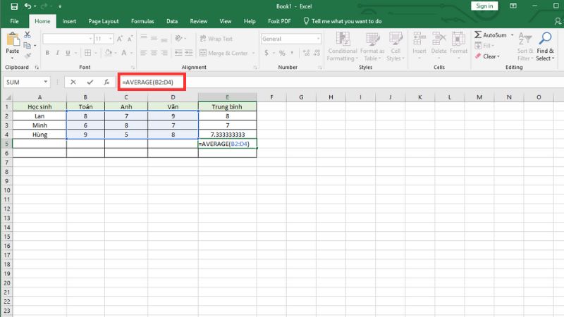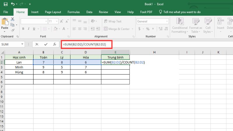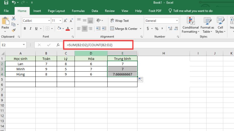 Cú pháp:=SUM(range)/COUNT(range) hoặc thủ công như=(SUM(C2:E2))/3.