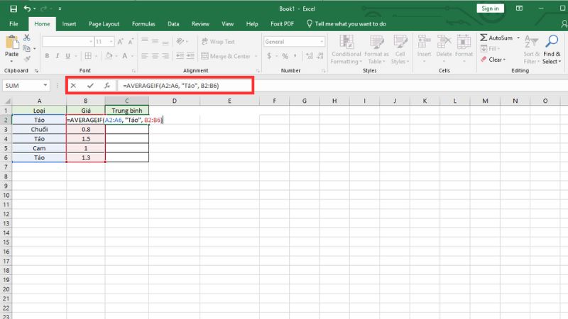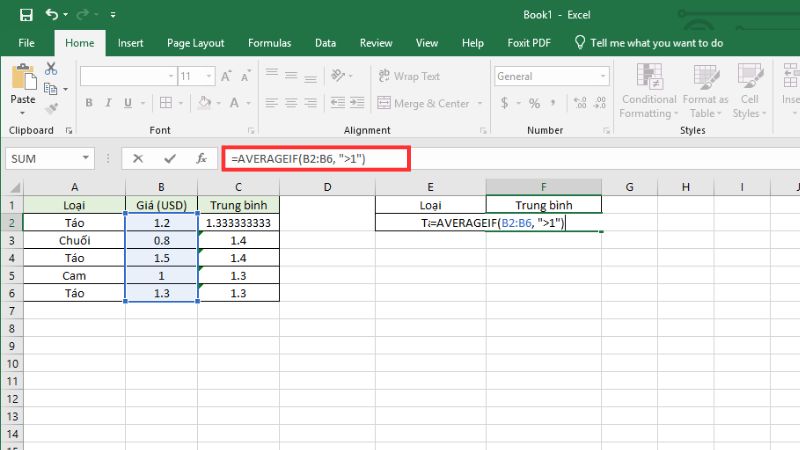 Ví dụ: Giả sử bạn có bảng doanh số bán hàng trái cây, và muốn tính trung bình giá chỉ cho loại "Táo"