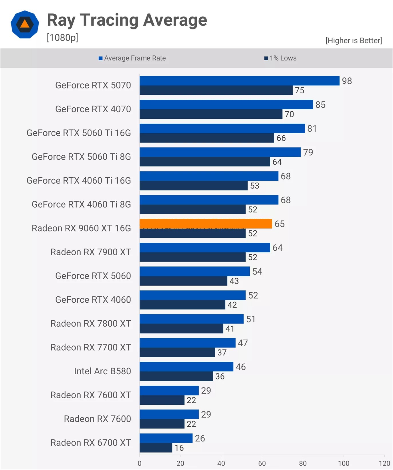 - Tính trung bình qua các bài kiểm tra, chiếc RX 9060 XT chậm hơn 20% so với đối thủ RTX 5060 Ti. Tốc độ trung bình nó đạt được là khoảng 65 fps.