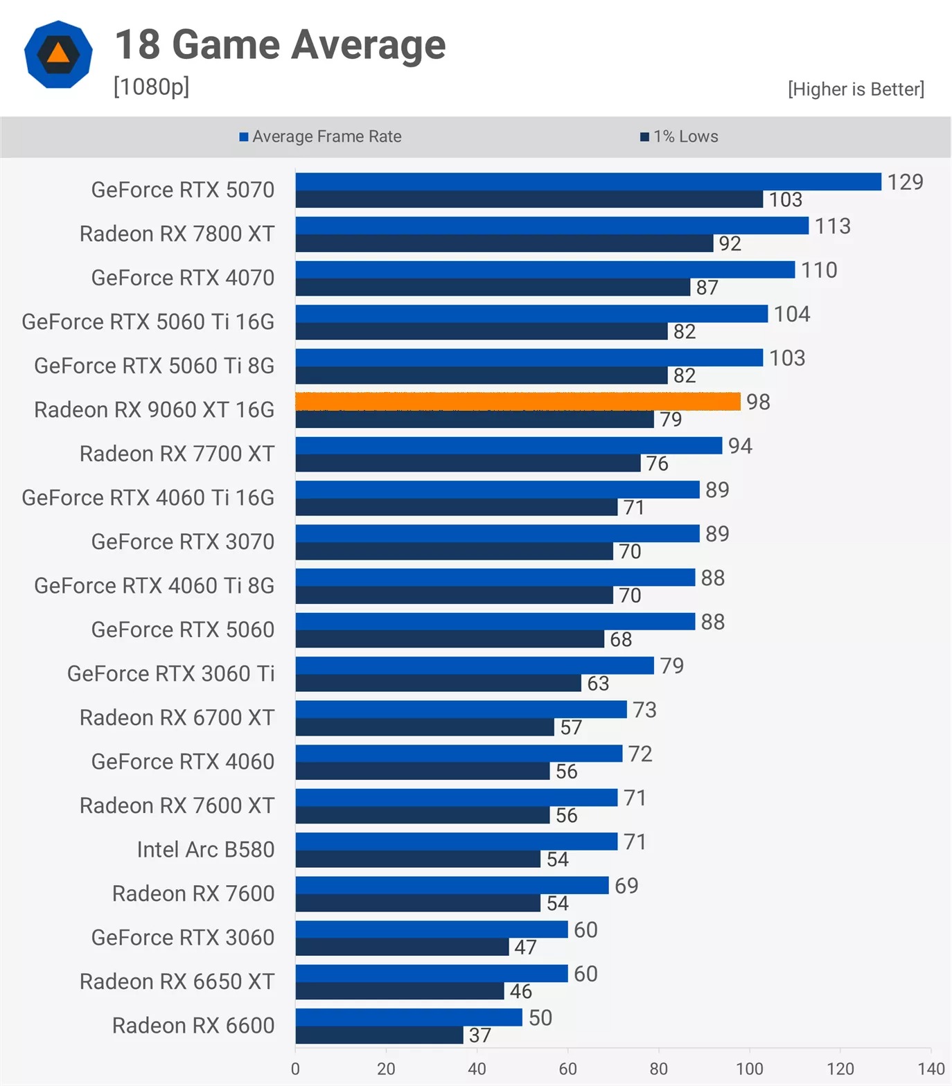 - Card RX 9060 XT và RTX 5060 Ti khá ngang tài ngang sức, tuy nhiên RX 9060 XT vẫn chậm hơn khoảng 6% về tổng thể.