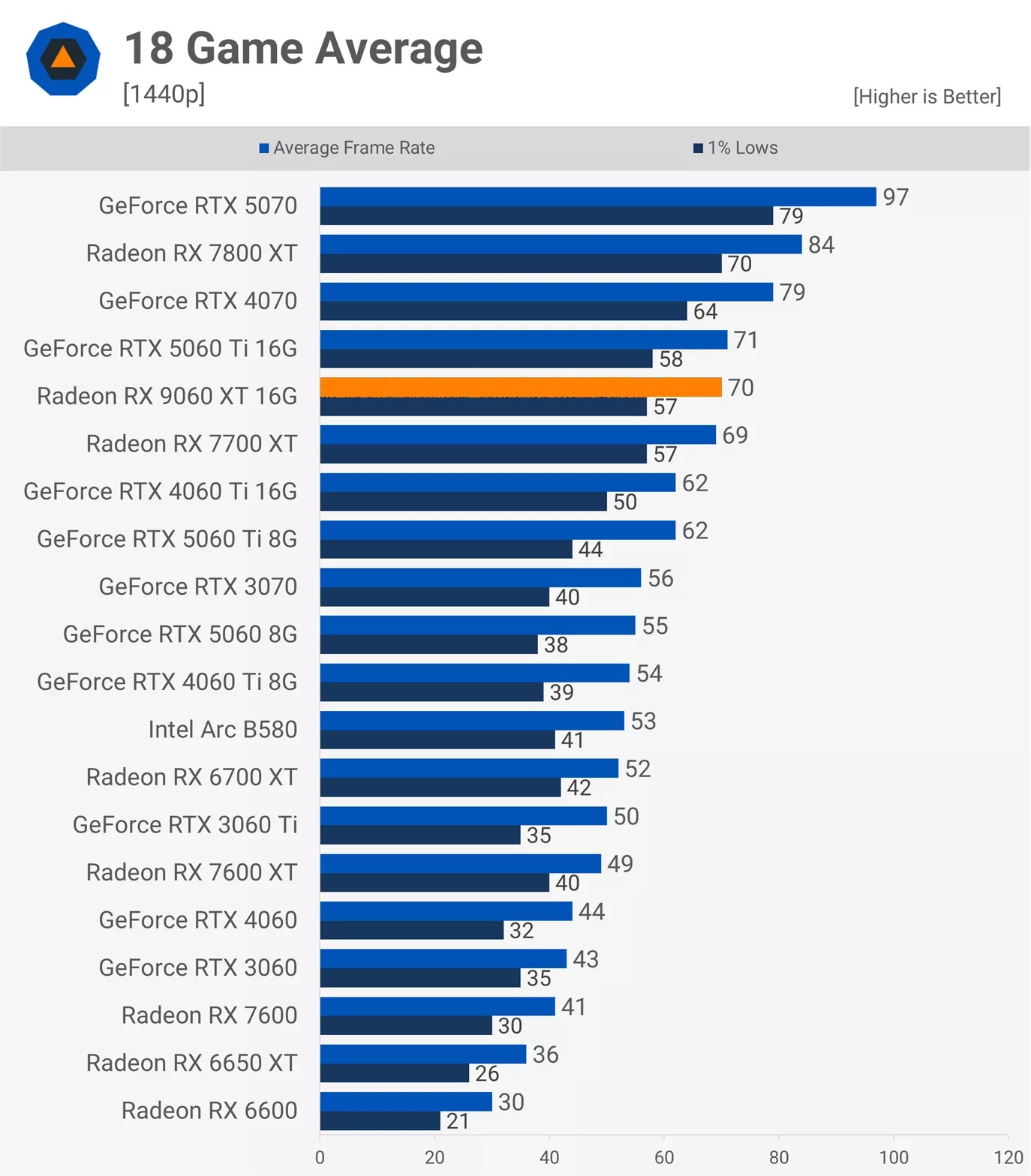 - Khi chơi game ở độ phân giải cao hơn này, RX 9060 XT thể hiện rất tốt. Nó đuổi sát nút RTX 5060 Ti, chỉ thua đúng 1 khung hình (FPS) hoặc 1%.