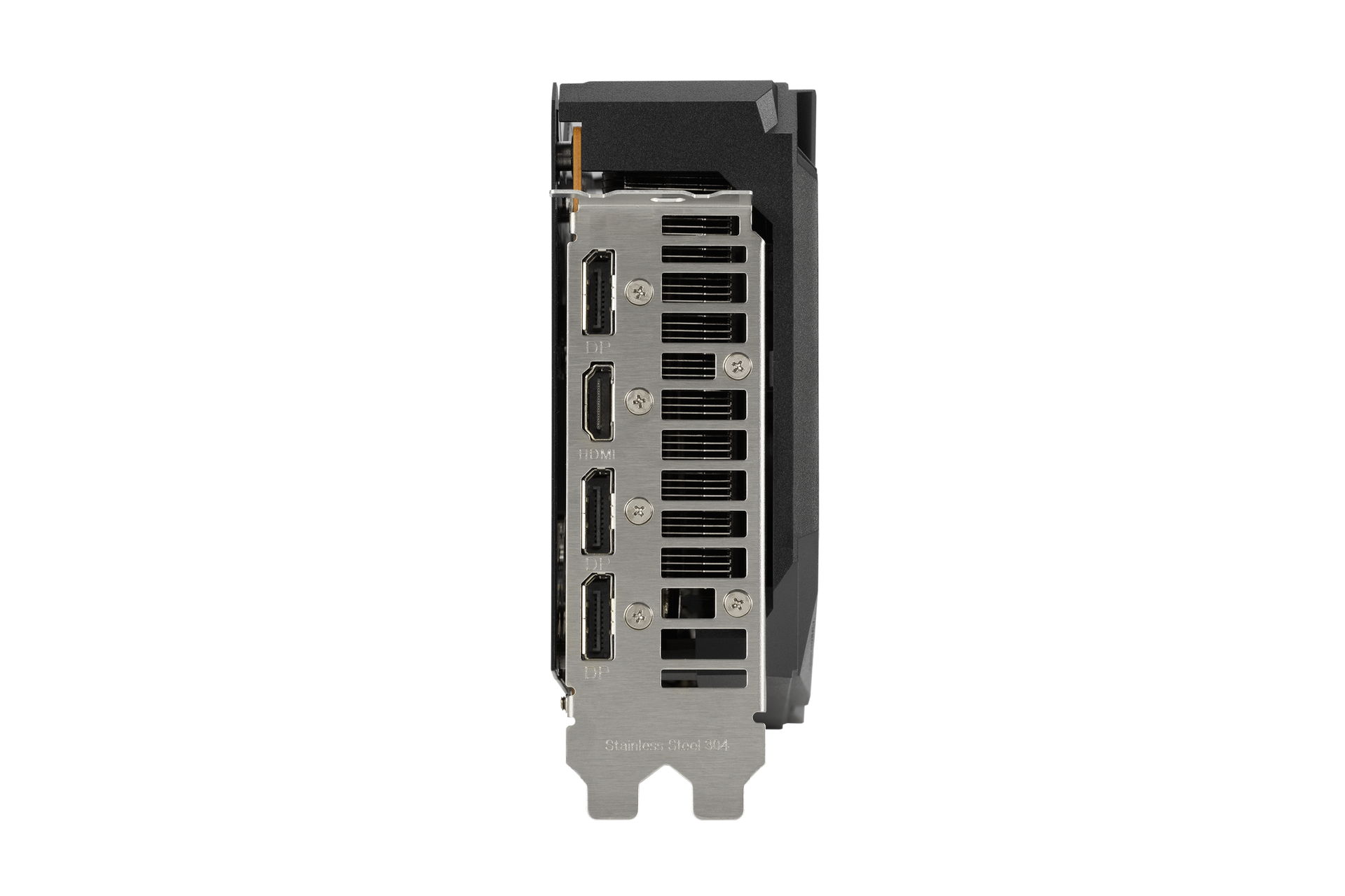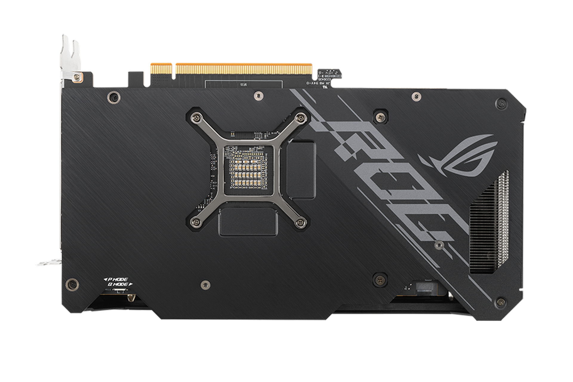 Mặt dưới của ASUS ROG Strix RX 6600 XT OC cho thấy những cải tiến hơn nữa. Phần lớn phía sau được bọc trong một tấm lưng kim loại bảo vệ nổi bật với một lỗ thông hơi rộng. Lỗ thông hơi cho phép không khí nóng thoát ra phía quạt thông gió của khung gầm thay vì bị dội ngược trở lại bộ làm mát. Giá đỡ GPU cung cấp thêm độ ổn định cho kết nối quan trọng giữa khuôn và bộ tản nhiệt. Và một công tắc Dual BIOS được đặt thuận tiện cho phép tùy chỉnh cấu hình hiệu suất mặc định của thẻ mà không cần phần mềm.
