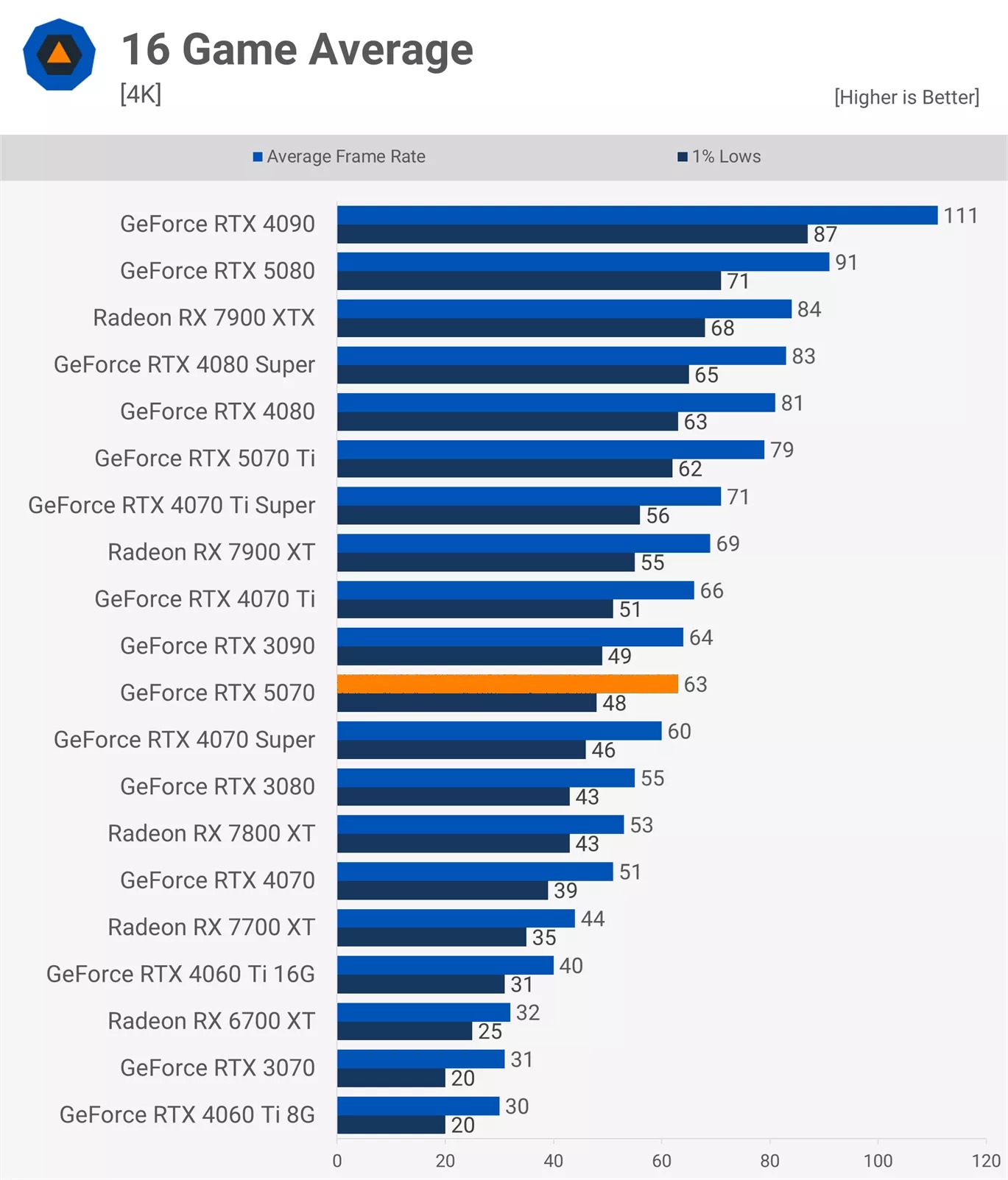 - Ở độ phân giải 4K: RTX 5070 chỉ nhanh hơn RTX 4070 Super khoảng 5%, và hiệu năng của nó ngang ngửa với con trùm cuối đời cũ kia là RTX 3090