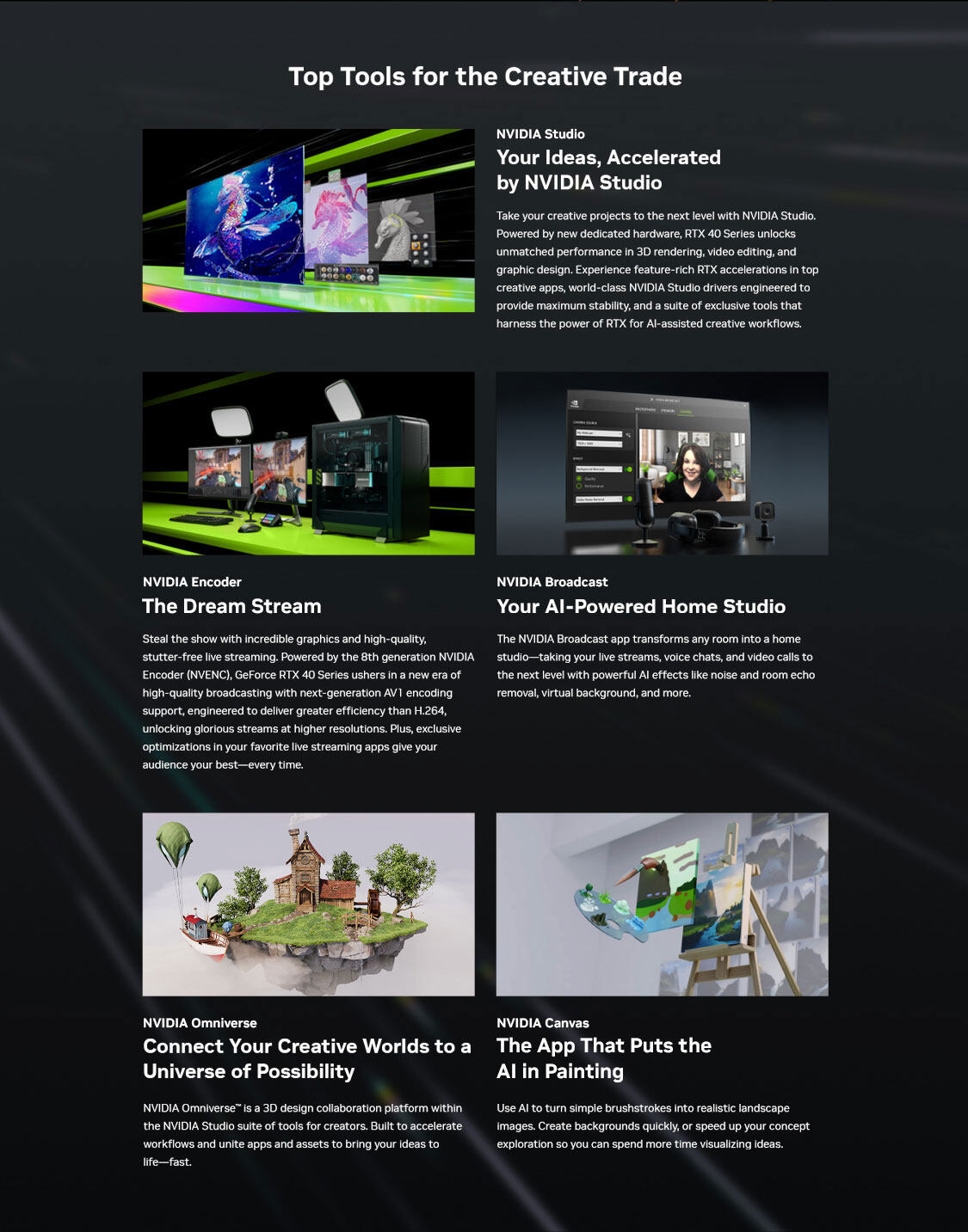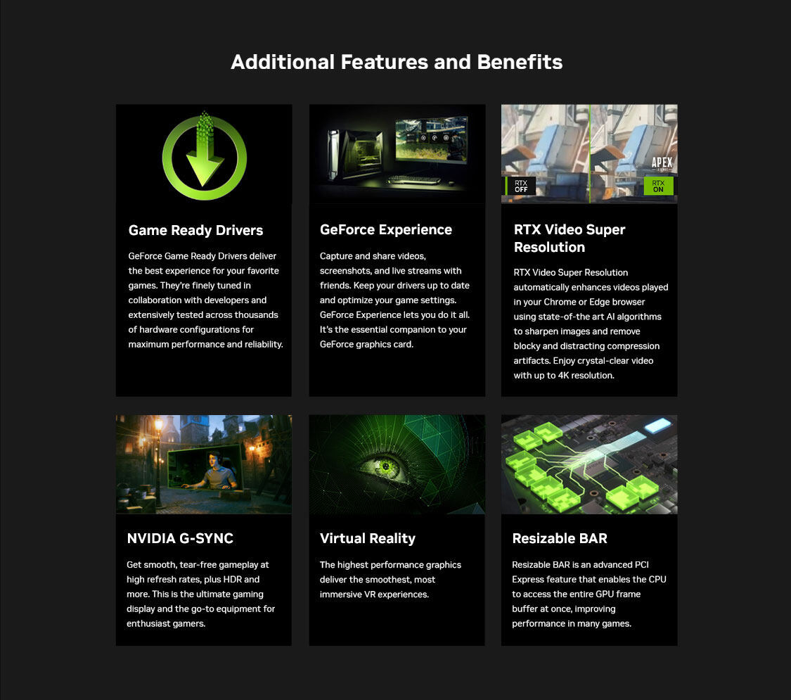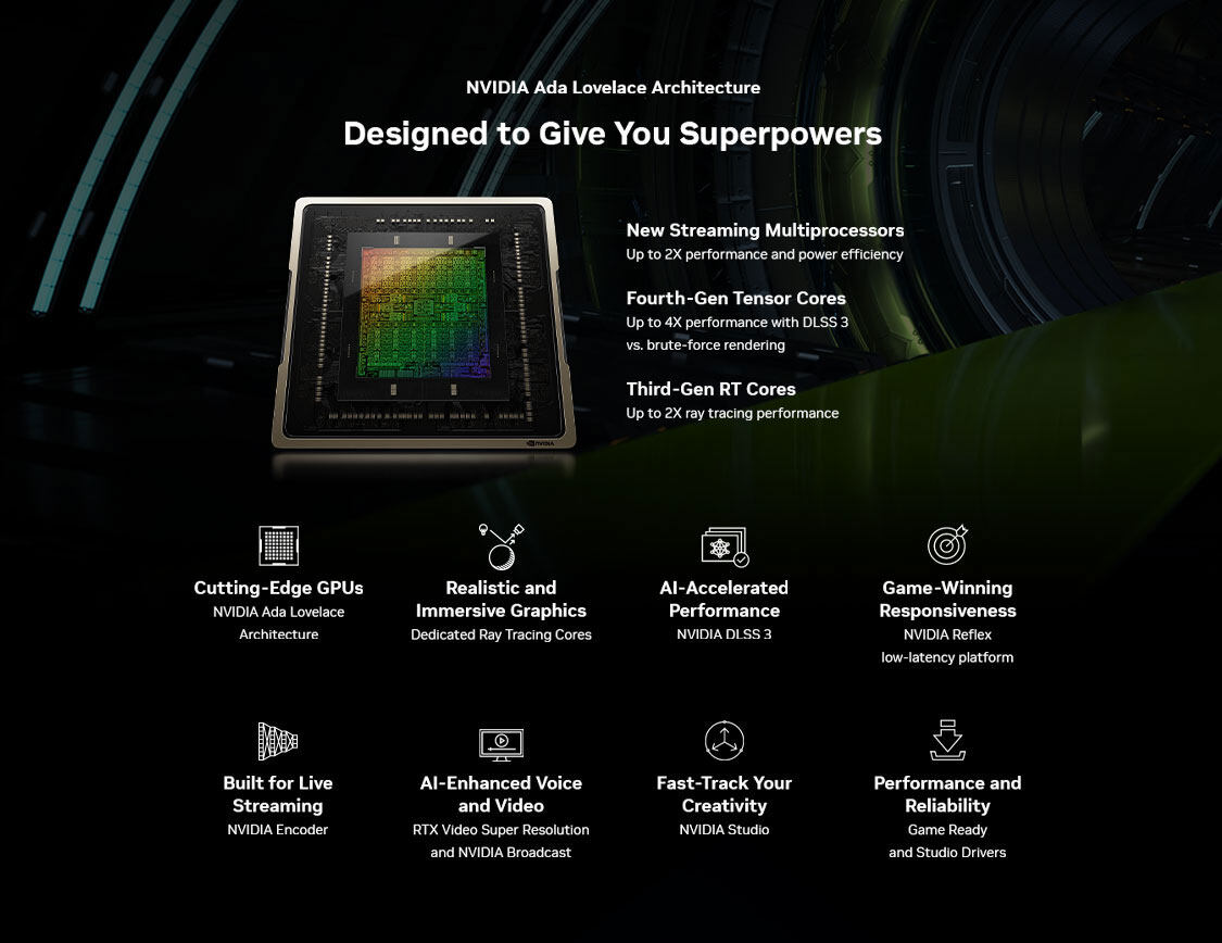 | NV TECHNOLOGY SUPPORT | NVIDIA DLSS 3, NVIDIA G-SYNC, 3rd Gen Ray Tracing Cores |