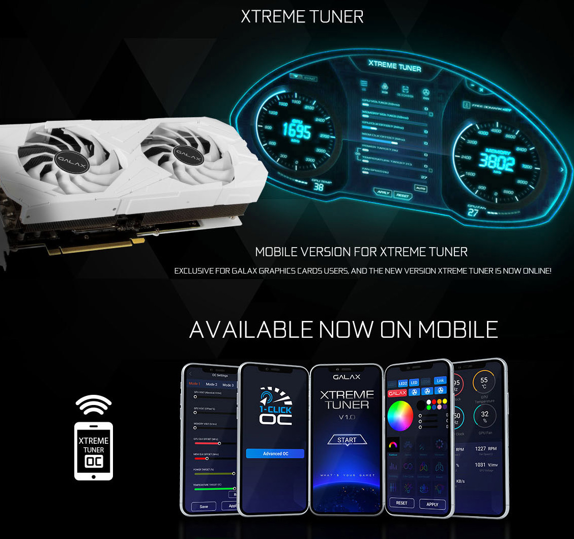Với ứng dụng Xtreme Tuner, giờ đây bạn có thể dễ dàng theo dõi và ép xung Card đồ họa GALAX bằng thiết bị di động của mình. Kiểm tra nhiệt độ, tần số và tốc độ quạt của card đồ họa. Điều chỉnh hiệu ứng RGB hoặc dễ dàng tăng hiệu suất card đồ họa của bạn bằng 1-Click OC và chia sẻ kết quả của bạn với chức năng chia sẻ tích hợp.