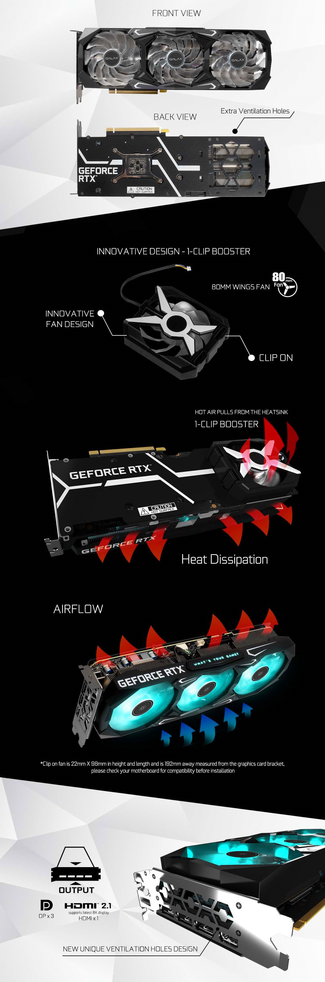 GALAX GeForce RTX 3070 Ti SG (1-Click OC) được trang bị ba quạt 92mm với một 1-Clip Booster (quạt phụ) hiện đại, có thể được cài đặt ở mặt sau và cho phép không khí lưu thông dễ dàng nhất có thể, đem đến khả năng làm mát vượt trội