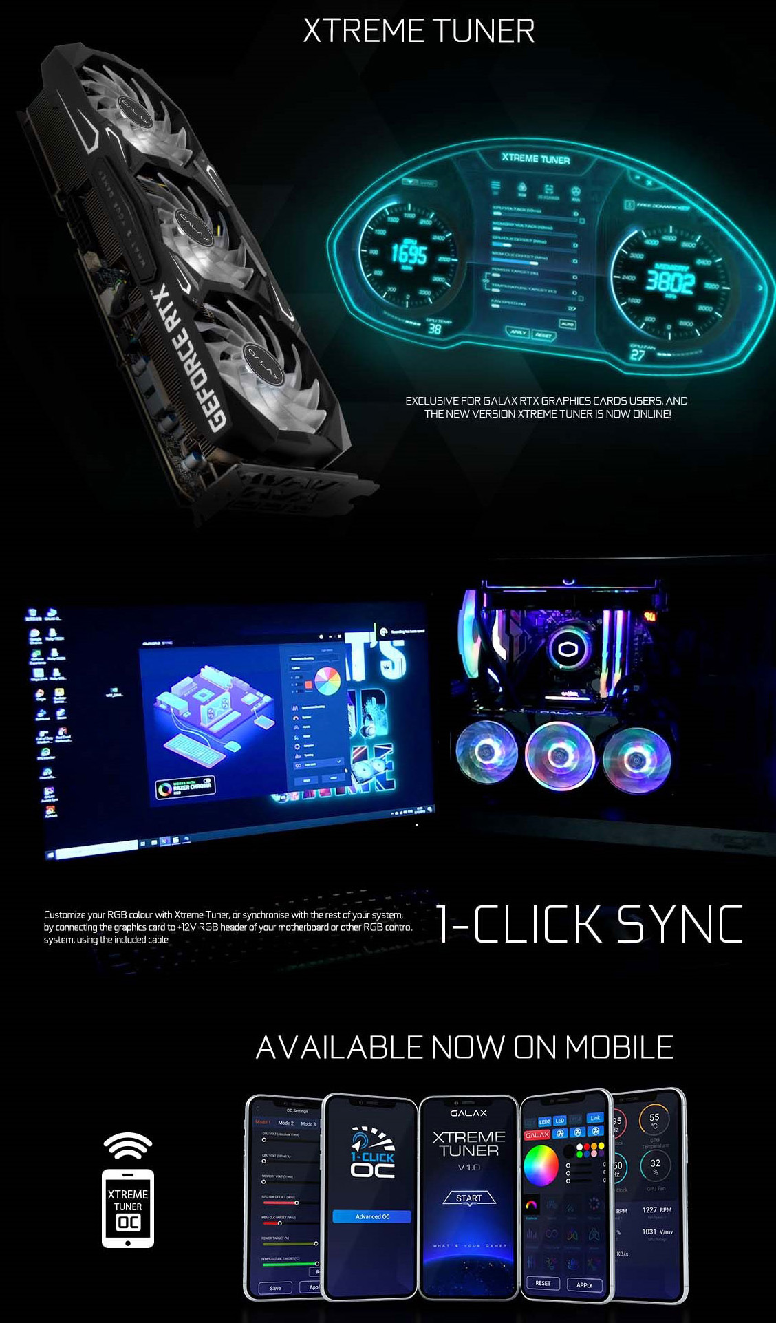 Với ứng dụng Xtreme Tuner, giờ đây bạn có thể dễ dàng theo dõi và ép xung Card đồ họa GALAX bằng thiết bị di động của mình. Kiểm tra nhiệt độ, tần số và tốc độ quạt của card đồ họa. Điều chỉnh hiệu ứng RGB hoặc dễ dàng tăng hiệu suất card đồ họa của bạn bằng 1-Click OC và chia sẻ kết quả của bạn với chức năng chia sẻ tích hợp.