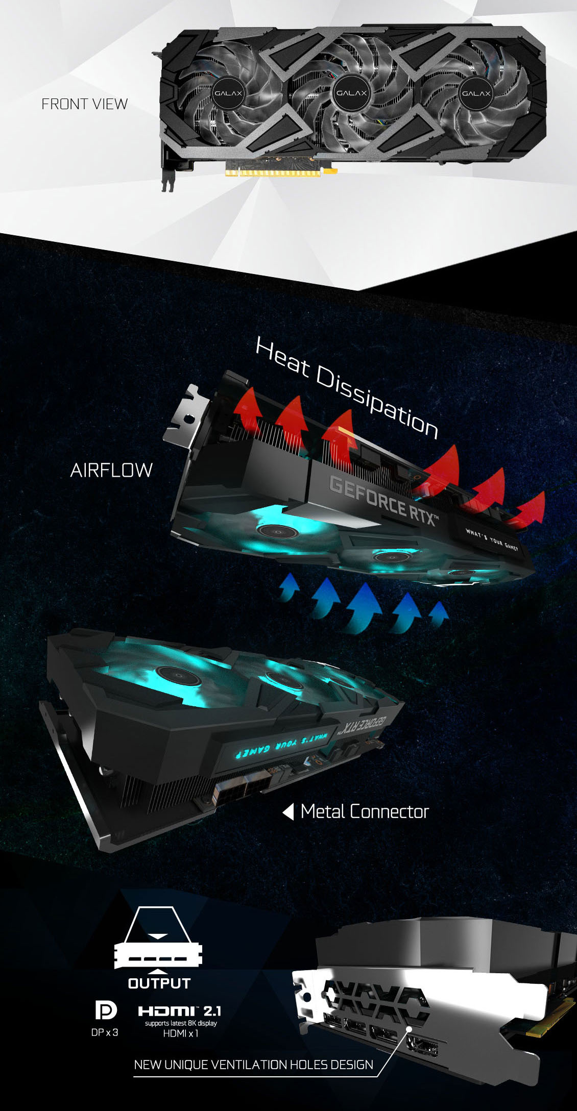 Card Màn Hình GALAX GeForce RTX 3080 Ti EXG (1-Click OC) sử dụng hệ thống Tri-Wings mới nhất với quạt 102mm ở giữa và quạt 92mm ở cả hai bên. Ngoài kích thước quạt mới, GALAX còn cung cấp thêm ba phong cách để mang lại nhiều lựa chọn khác nhau cho người dùng.
