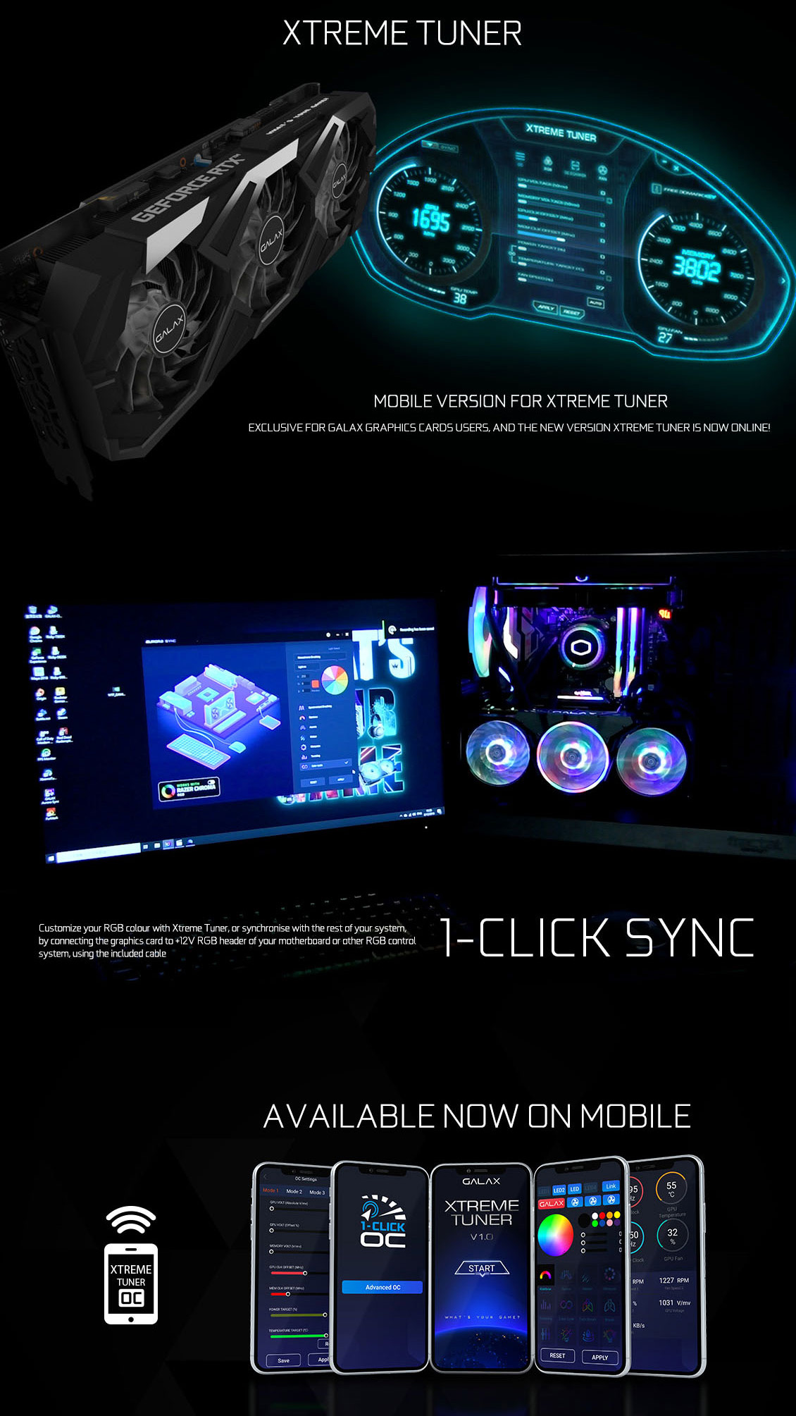 Với Ứng dụng Xtreme Tuner, giờ đây bạn có thể dễ dàng theo dõi và ép xung Cạc đồ họa GALAX bằng thiết bị di động của mình. Kiểm tra nhiệt độ, tần số và tốc độ quạt của card đồ họa của bạn. Điều chỉnh hiệu ứng RGB hoặc dễ dàng tăng hiệu suất card đồ họa của bạn bằng 1-Click OC và chia sẻ kết quả của bạn với chức năng chia sẻ tích hợp.