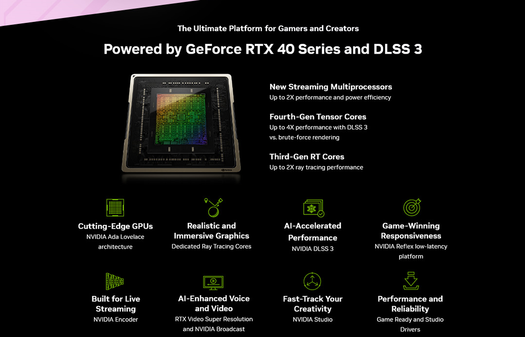 | Hiện thị thêm | Bộ đa xử lý phát trực tuyến NVIDIA Ada Lovelace: Hiệu suất và hiệu suất năng lượng cao gấp 2 lần Lõi Tensor thế hệ thứ 4: Hiệu suất AI lên tới 2 lần Lõi RT thế hệ thứ 3: Hiệu suất dò tia lên tới 2X Microsoft DirectX® 12 Ultimate Bộ nhớ đồ họa GDDR6X NVIDIA DLSS NVIDIA® GeForce Experience™ NVIDIA G-SYNC® NVIDIA GPU Boost™ Trình điều khiển sẵn sàng cho trò chơi API Vulkan RT, OpenGL 4.6 DisplayPort 1.4a, HDMI 2.1 HDCP 2.3 Sẵn sàng VR |