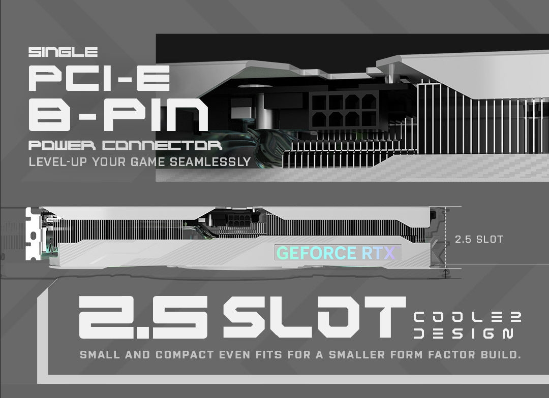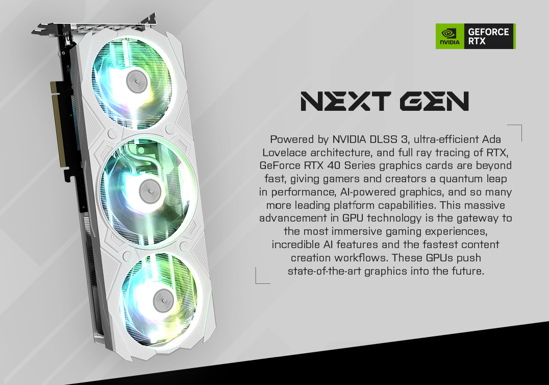 Được hỗ trợ bởi NVIDIA DLSS 3, kiến trúc Ada Lovelace cực kỳ hiệu quả và khả năng dò tia đầy đủ, GeForce RTX 4070 Extreme Gamer có ba quạt có 5.888 lõi CUDA và bộ nhớ GDDR6X 12GB 192 bit tốc độ siêu tốc 21Gbps, cũng như 1-Click độc quyền Xung nhịp OC là 2550MHz thông qua phần mềm chuyên dụng Xtreme Tuner Plus. Vì được trang bị một đầu nối nguồn 8 chân PCI-E duy nhất và bộ làm mát khe cắm 2.5 siêu nhẹ, GPU mới nhất mang đến trải nghiệm nâng cấp liền mạch cho người dùng.