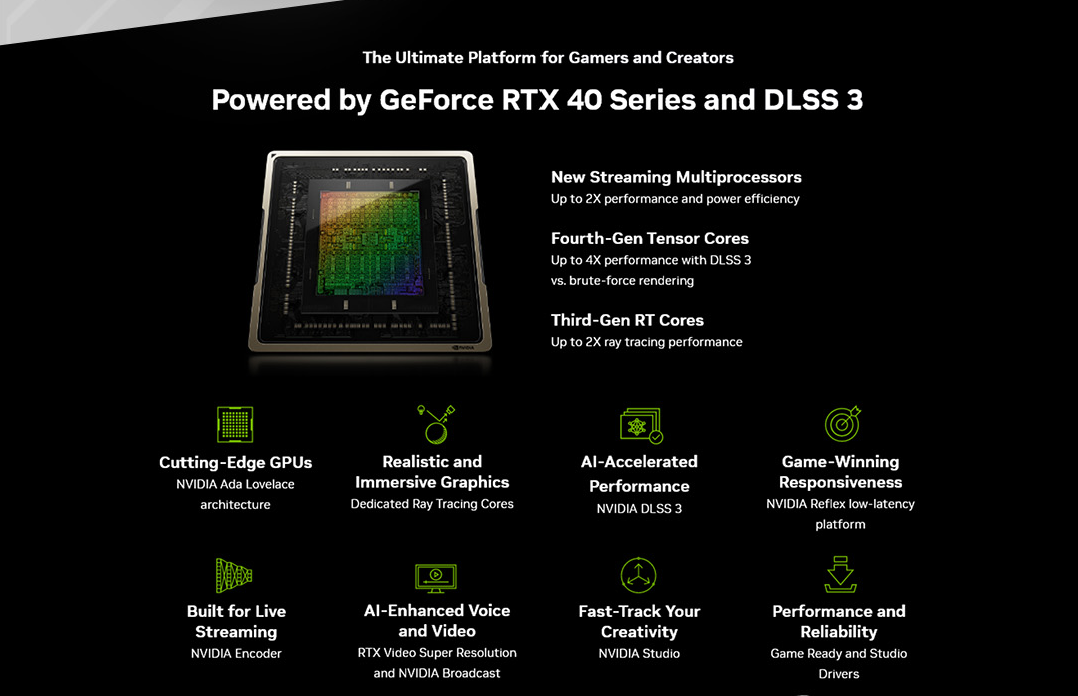 | Hiện thị thêm | Bộ đa xử lý phát trực tuyến NVIDIA Ada Lovelace: Hiệu suất và hiệu suất năng lượng cao gấp 2 lần Lõi Tensor thế hệ thứ 4: Hiệu suất AI lên tới 2 lần Lõi RT thế hệ thứ 3: Hiệu suất dò tia lên tới 2X Microsoft DirectX® 12 Ultimate Bộ nhớ đồ họa GDDR6X NVIDIA DLSS NVIDIA® GeForce Experience™ NVIDIA G-SYNC® NVIDIA GPU Boost™ Trình điều khiển sẵn sàng cho trò chơi API Vulkan RT, OpenGL 4.6 DisplayPort 1.4a, HDMI 2.1 HDCP 2.3 Sẵn sàng VR |
