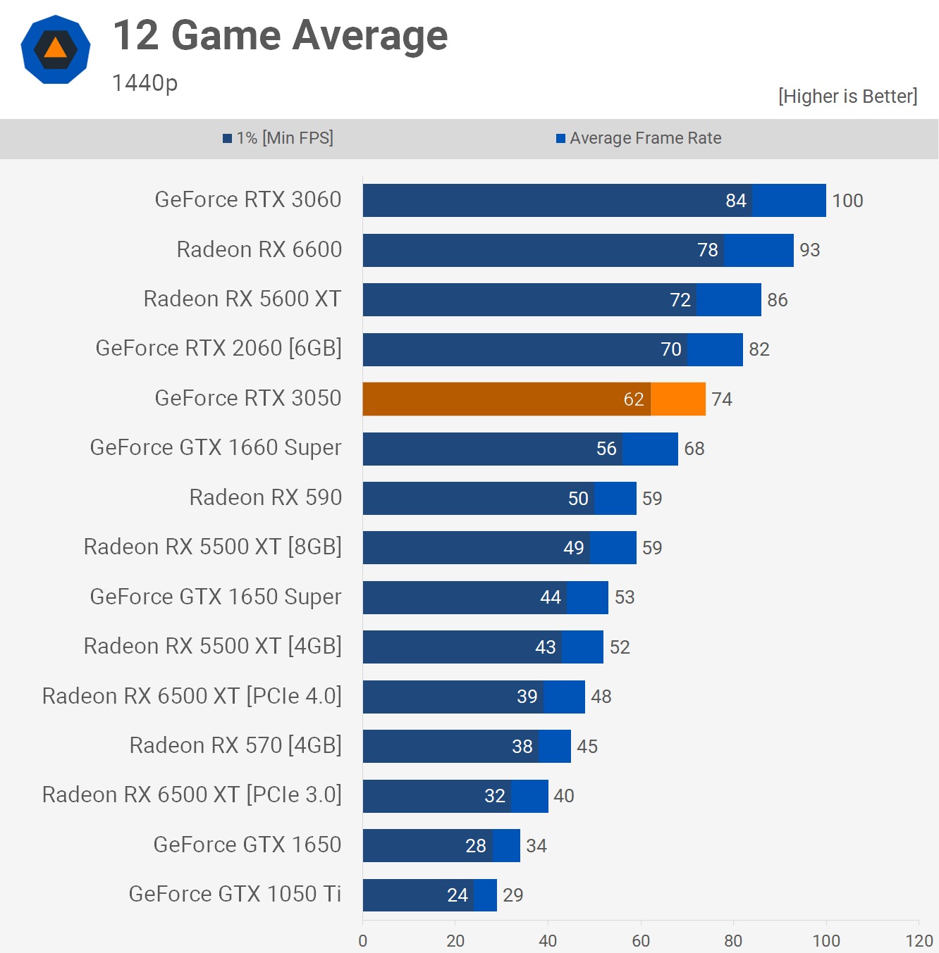 - Khoảng cách càng nới rộng và gây bất lợi lớn cho chiếc RX 6500 XT. Ở độ phân giải này, RTX 3050 nhanh hơn đối thủ 54% (hoặc nhanh hơn tới 85% nếu so trên chuẩn PCIe 3.0).