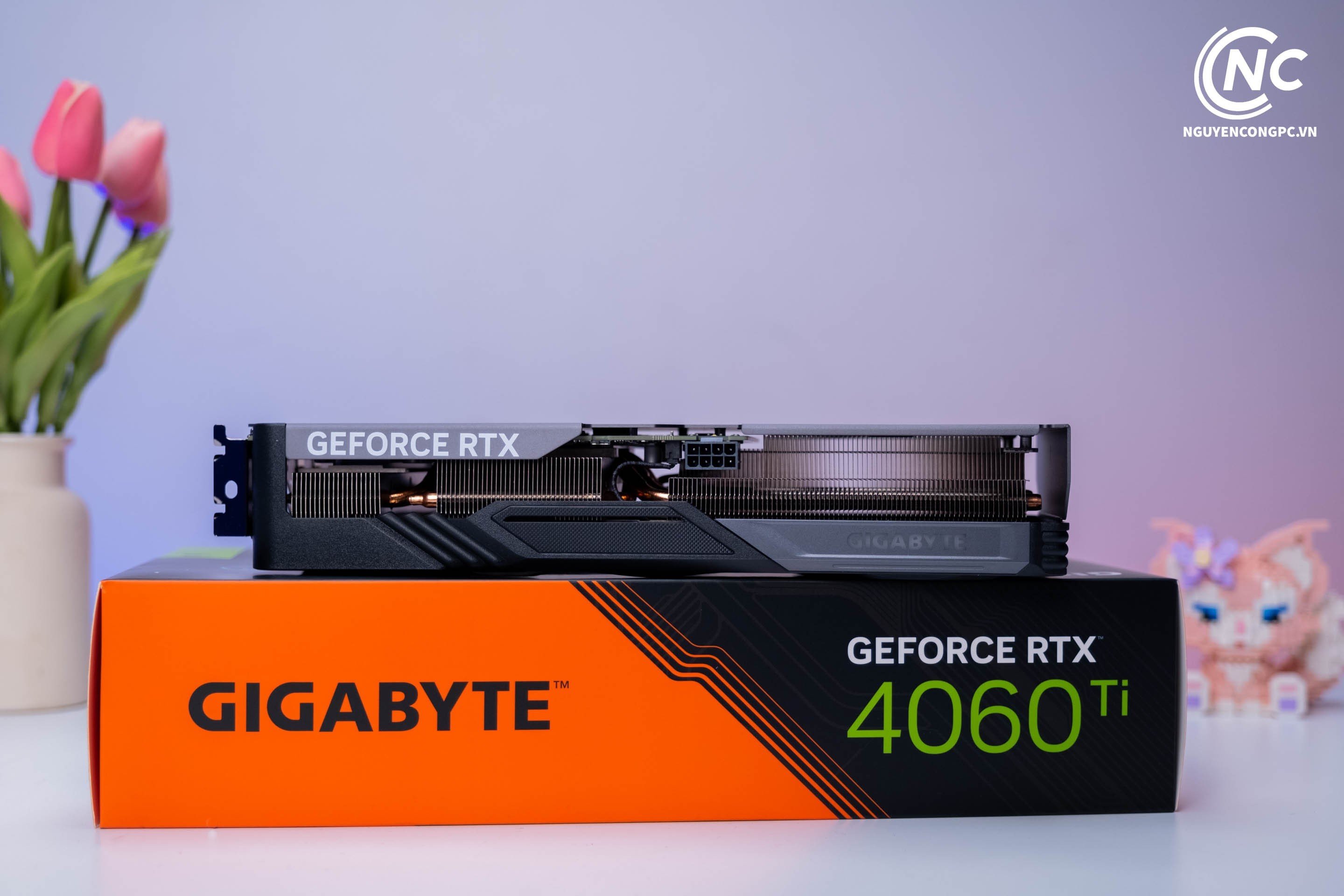 Ở mặt sau của GIGABYTE RTX 4060 Ti GAMING OC 8G, chúng ta sẽ được gây chú ý với không gian mở dành cho những tấm tản nhiệt. Nhờ vào đó mà luồng không khí dễ dàng được đi qua và đem hơi nóng đi xa khỏi chiếc card màn hình.