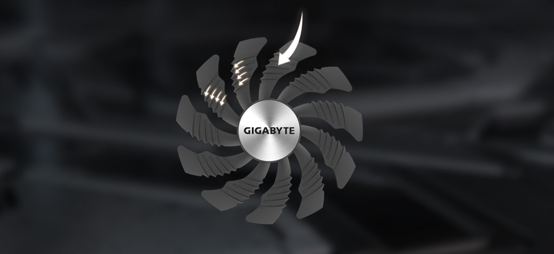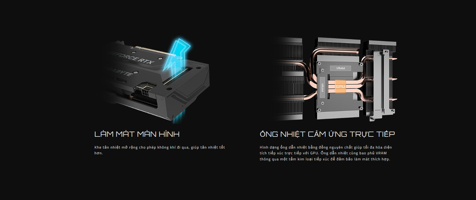 Hệ thống làm mát WINDFORCE có hai quạt cánh độc đáo 90mm, quay xen kẽ, 3 ống dẫn nhiệt bằng đồng composite chạm trực tiếp vào GPU, quạt hoạt động 3D và Làm mát màn hình, cùng nhau mang lại khả năng tản nhiệt hiệu quả cao.