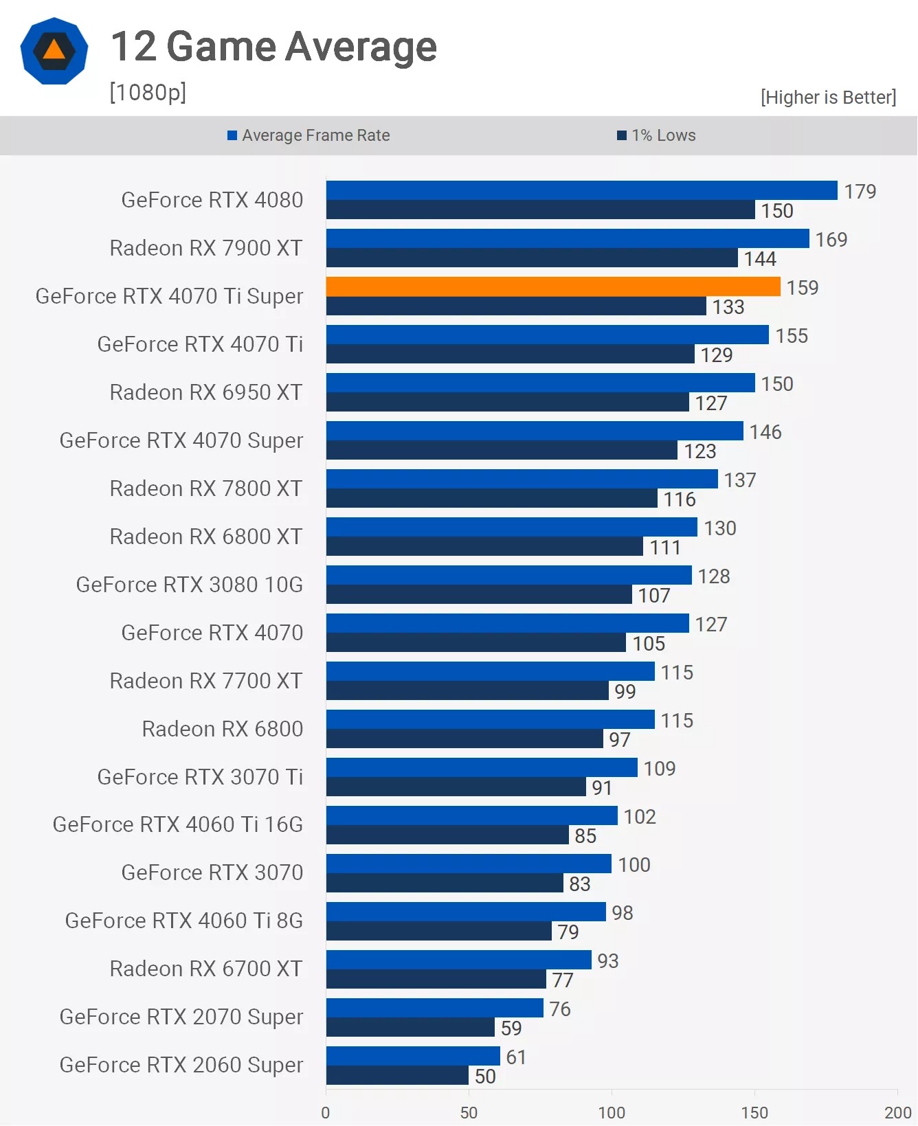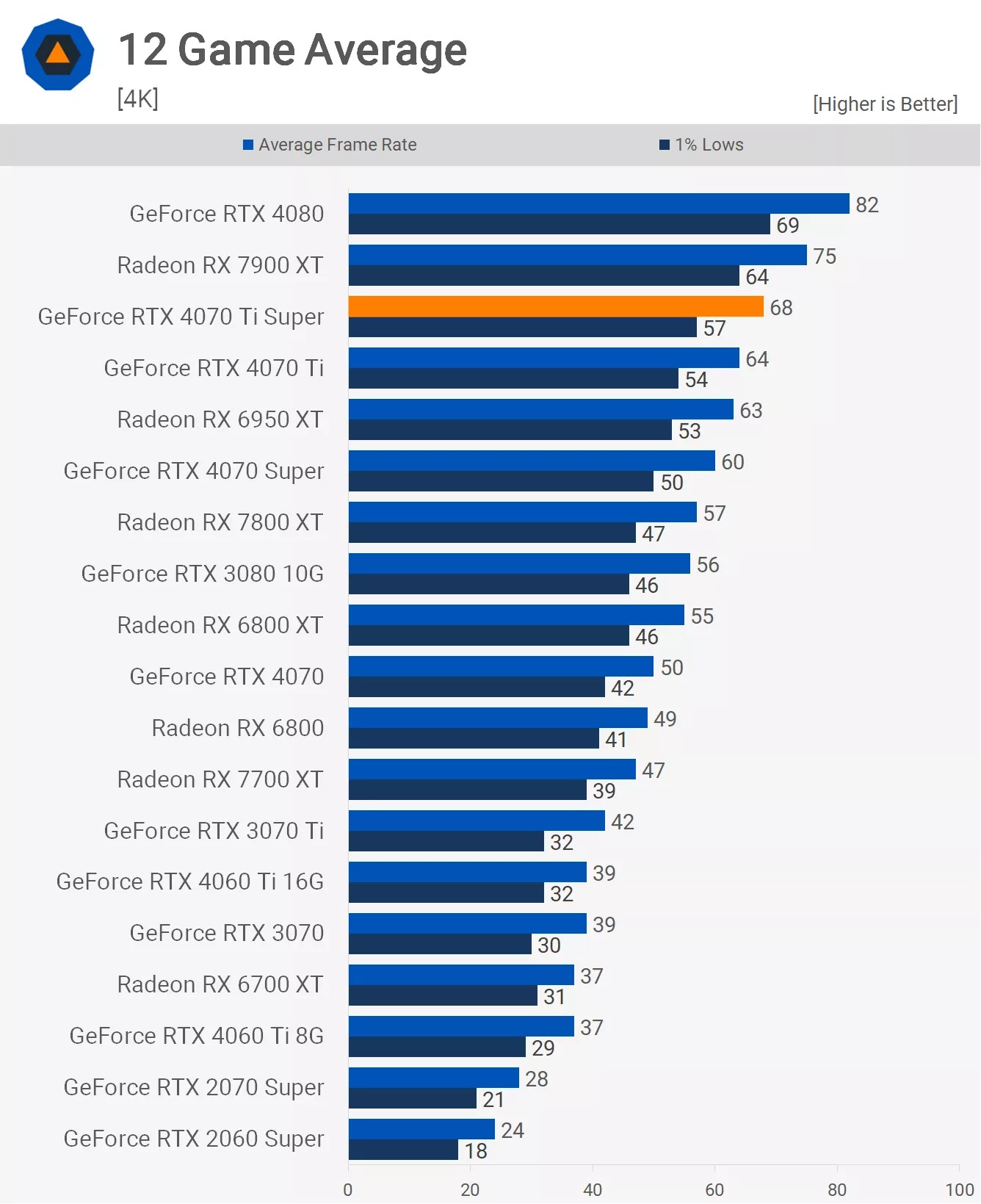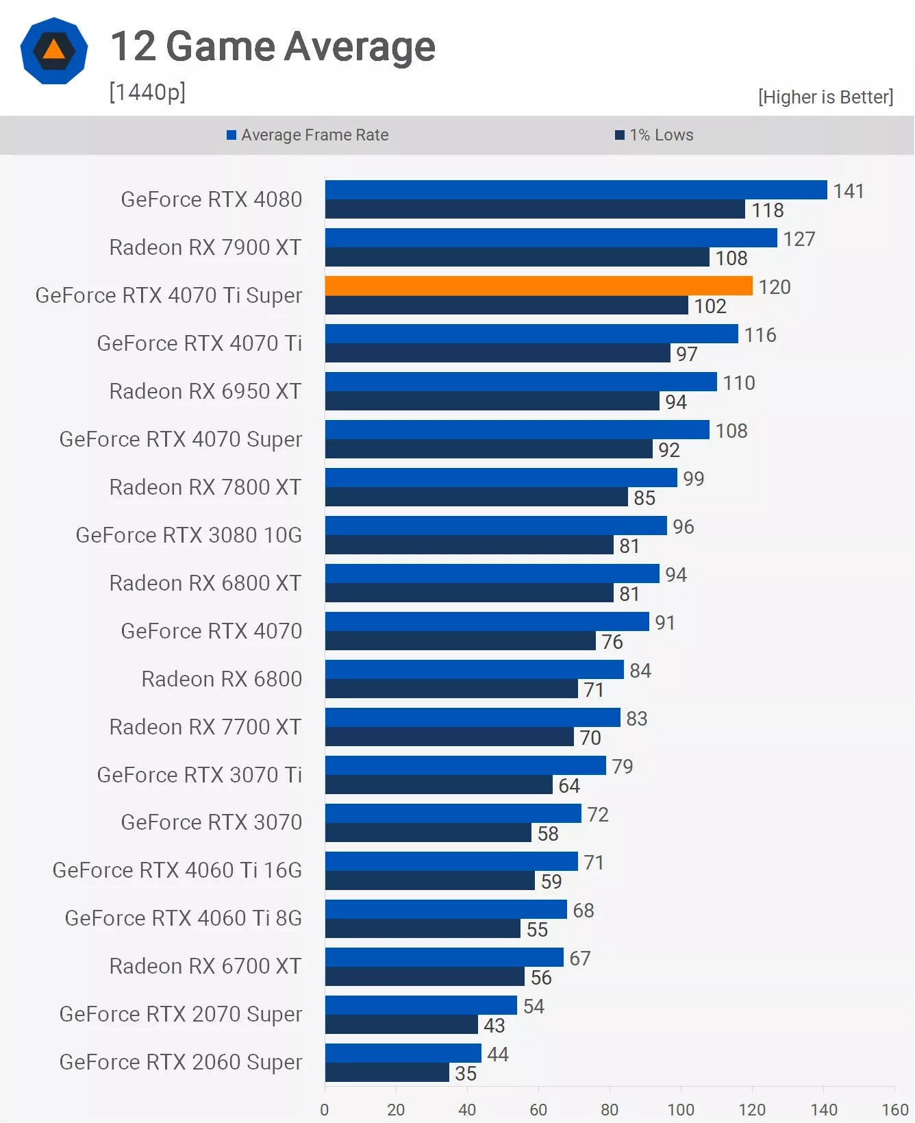 - Khoảng cách chênh lệch vẫn y hệt như trên. Bản Ti Super vẫn thua RX 7900 XT 6% và chỉ nhỉnh hơn bản cũ 3%.