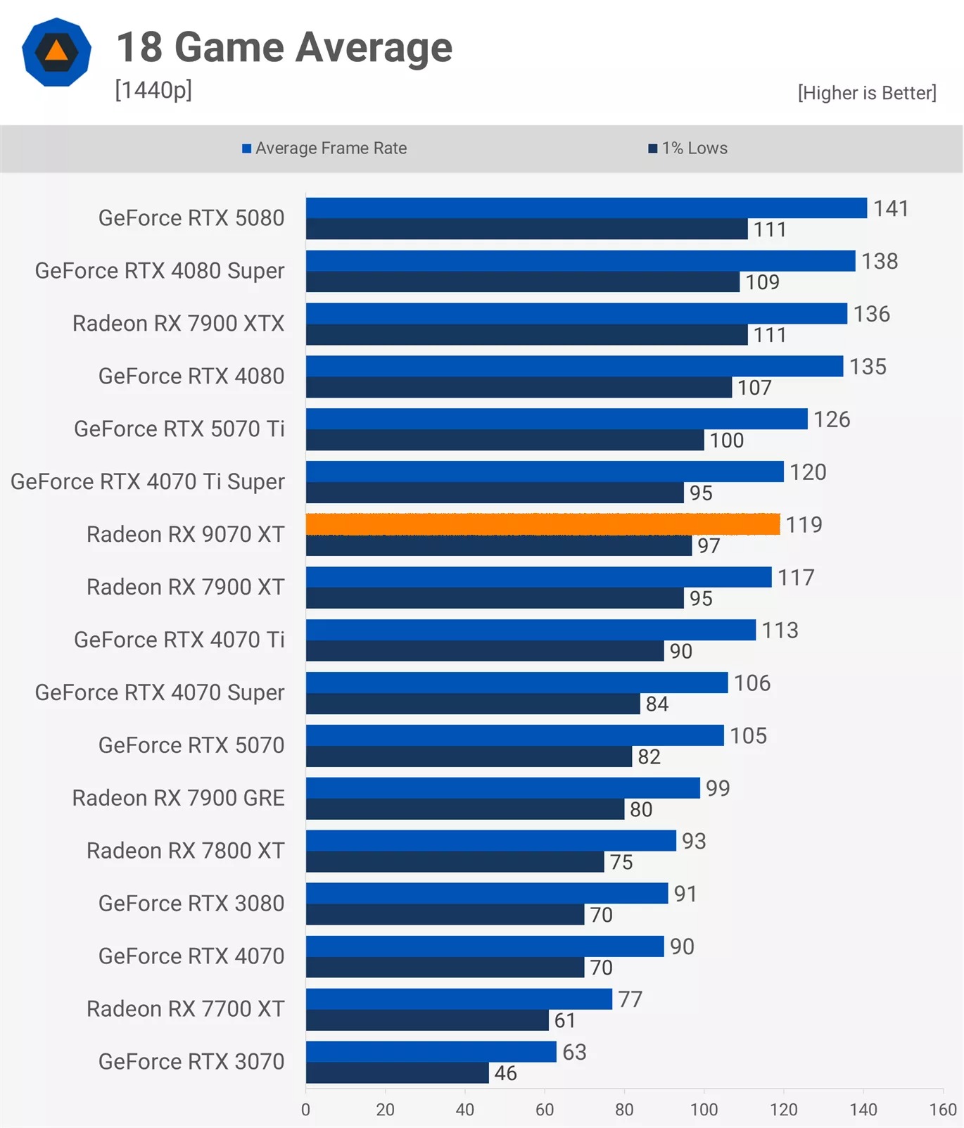 Qua thử nghiệm trên 18 tựa game khác nhau, card đồ họa 9070 XT đạt tốc độ trung bình là 119 fps (khung hình/giây) ở độ phân giải 1440p.