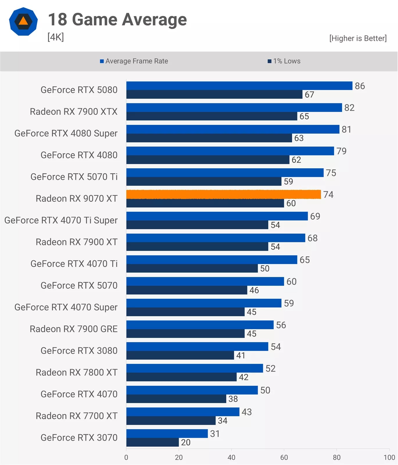 Khi chuyển sang độ phân giải 4K, chiếc 9070 XT thể hiện tốt hơn một chút. Nó chỉ thua kém 5070 Ti đúng 1%, trong khi lại mạnh hơn 7900 XT tới 9%.