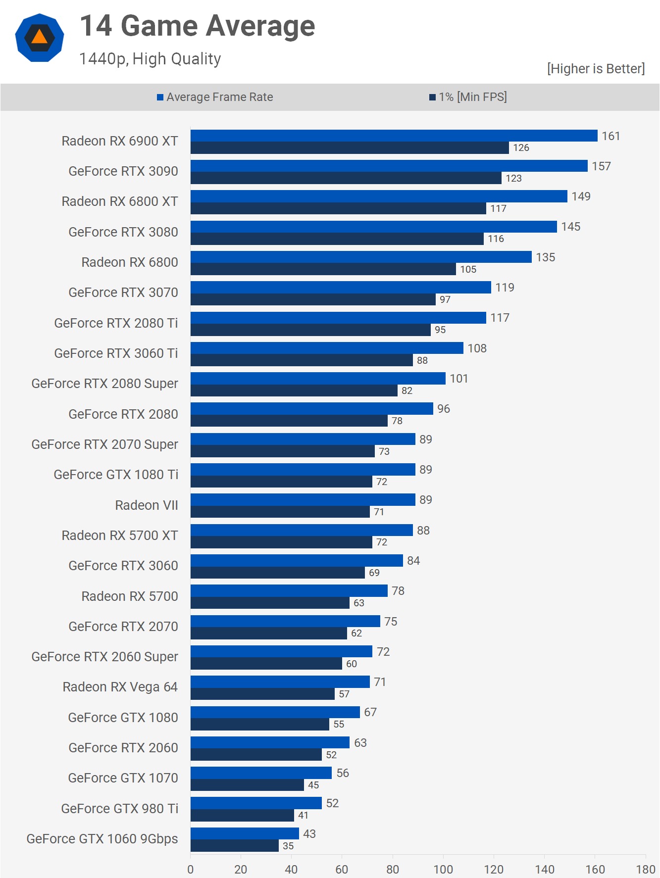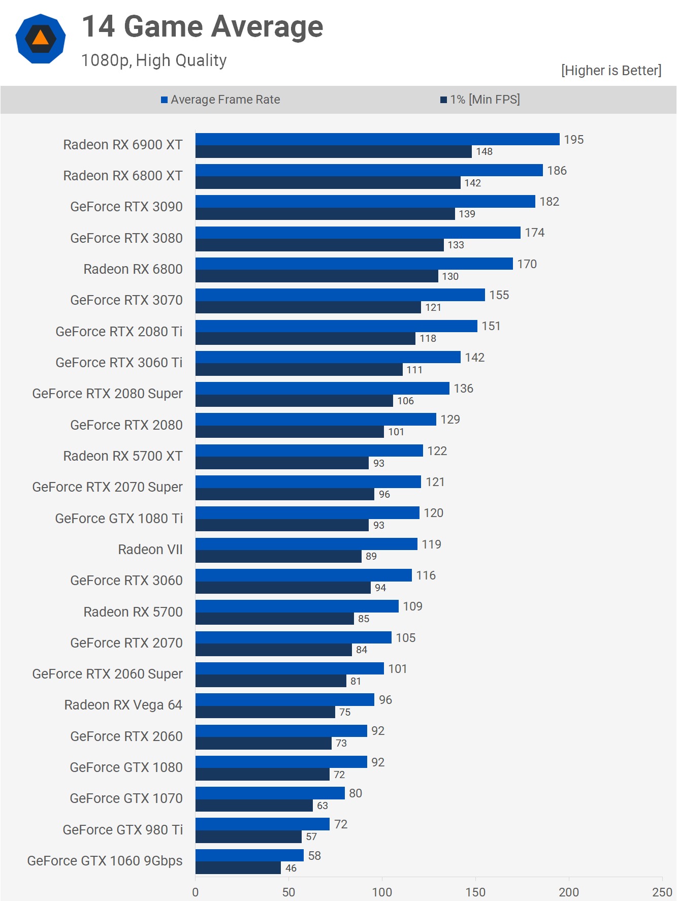 Dựa trên kết quả test trung bình của 14 tựa game, RTX 3060 chỉ mạnh hơn đối thủ cũ bên đội AMD là RX 5700 khoảng 6%. Nó mạnh hơn con card đời trước là RTX 2060 Super (cũng 2 năm tuổi) khoảng 15%, trong khi giá bán lại rẻ hơn 18%.