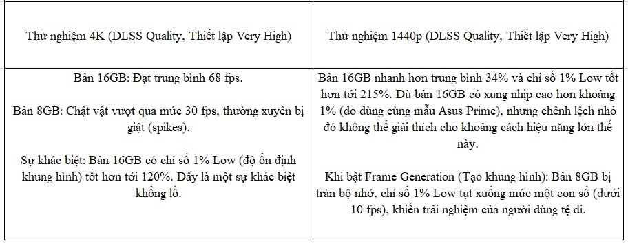 Mặc dù chip xử lý (GPU) của 5060 Ti đủ khỏe để render hình ảnh 1440p Ultra, nhưng bộ nhớ 8GB lại là "kẻ ngáng đường". Ở độ phân giải 1440p, nếu bạn bật Texture mức Ultra và Ray Tracing tối đa, hiện tượng tràn VRAM sẽ xảy ra, gây giật cục bộ.
