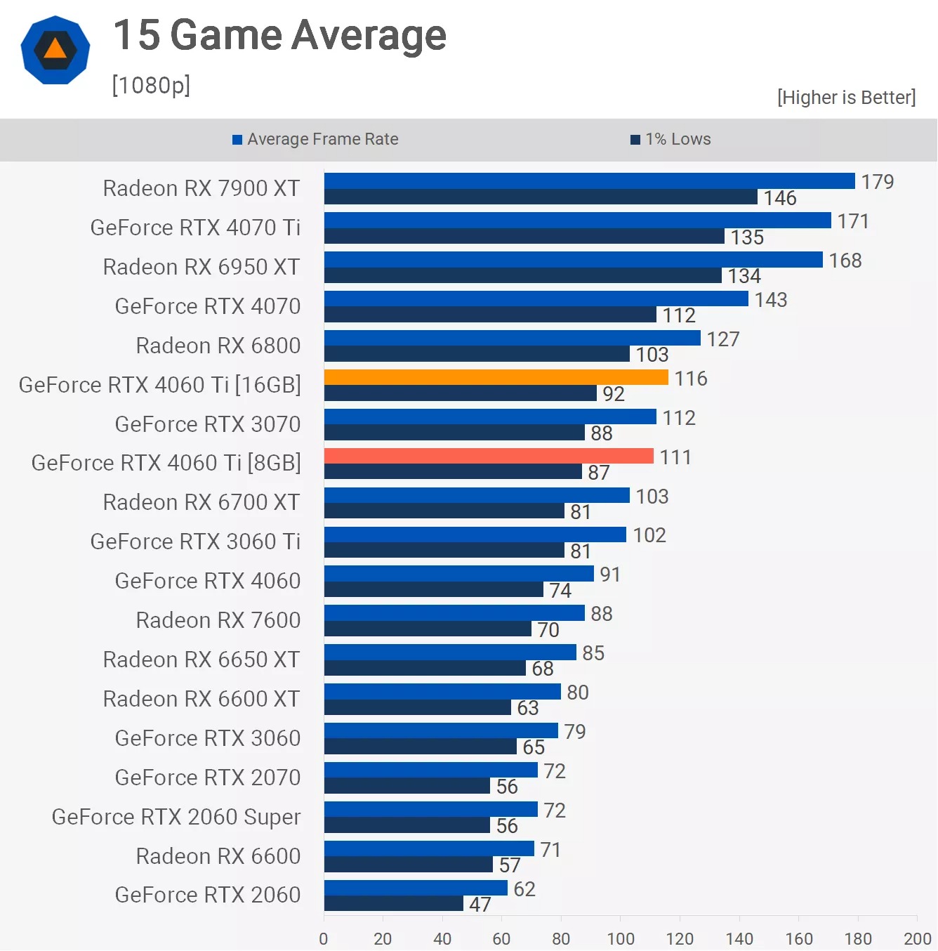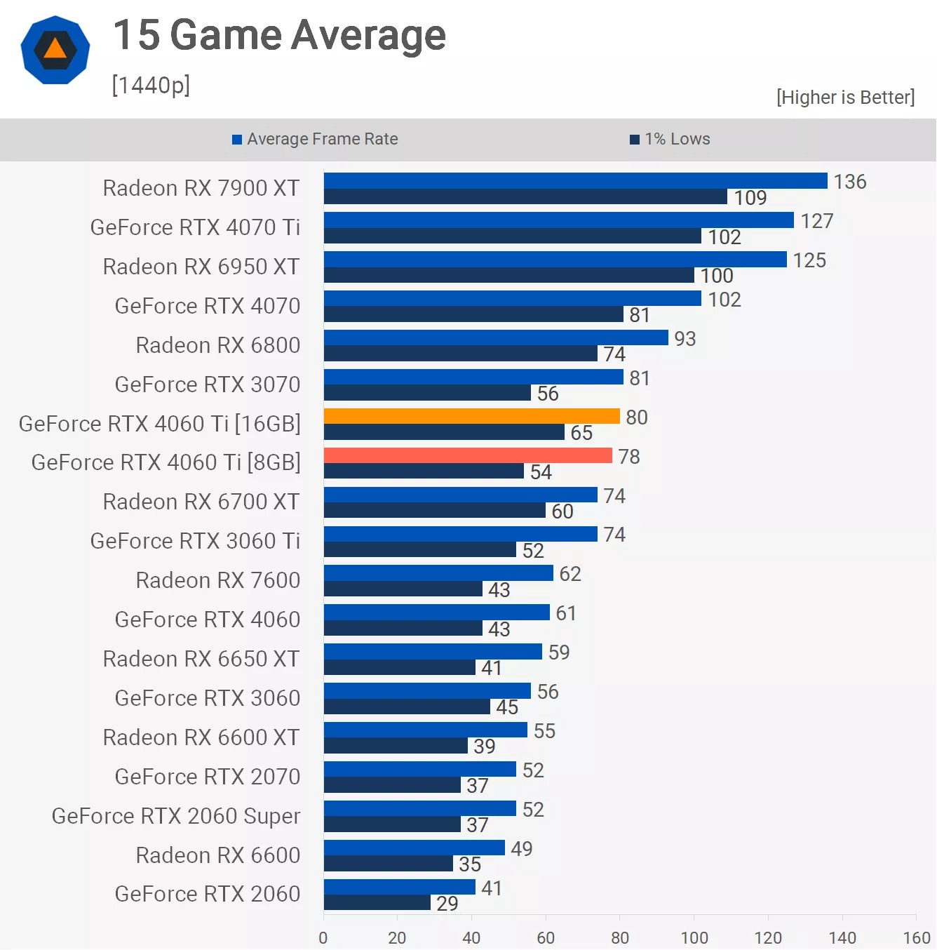 - Phiên bản RTX 4060 Ti 16GB chỉ nhanh hơn trung bình khoảng 4% so với RTX 4060. Điều này hoàn toàn nằm trong dự tính, vì hầu hết các game được test đều không cho thấy sự khác biệt lớn về độ mượt mà giữa hai phiên bản.