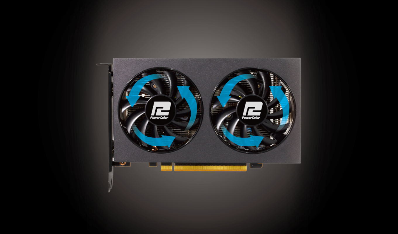 Card đồ họa PowerColor Radeon™ RX 6500 XT Fighter được trang bị thiết kế quạt làm mát kép 80mm, mát mẻ và yên tĩnh, lý tưởng cho những ai muốn chơi game mà không bị phân tâm.