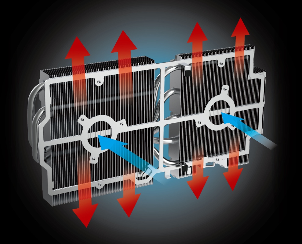 Đế tiếp xúc GPU: cảm ứng trực tiếp: Một đế đồng mạ niken mịn tiếp xúc trực tiếp với GPU để tăng cường khả năng truyền nhiệt vượt trội và cải thiện khả năng tản nhiệt từ VRAM để giữ cho thẻ luôn trong tình trạng làm mát tối ưu.