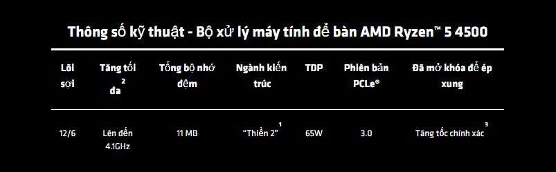 AMD Ryzen 5 4500 là vi xử lý có 6 nhân 12 luồng, nó có xung cơ bản 3,6 GHz xung Boost 4,1 GHz. Bộ đệm L3 có 8MB. Với những thông số ấn tượng đó nó sẽ mang đến một bước đột phá đáng kinh ngạc trong hiệu suất. Bạn sẽ thực hiện các ứng dụng đa nhiệm nhanh hơn và chơi game HD mượt mà.