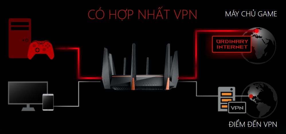 Nếu bạn đang chán ngán với tình trạng mạng riêng ảo làm chậm hiệu năng game, ROG đã có giải pháp. ROG Rapture GT-AC5300 sở hữu tính năng sắc bén có tên Hợp nhất VPN, cho phép bạn chạy VPN và kết nối mạng thông thường song song cùng lúc! Vì thế, ngay cả khi người dùng mạng cần sử dụng VPN, bạn vẫn có thể tận hưởng tốc độ chơi game tối đa.