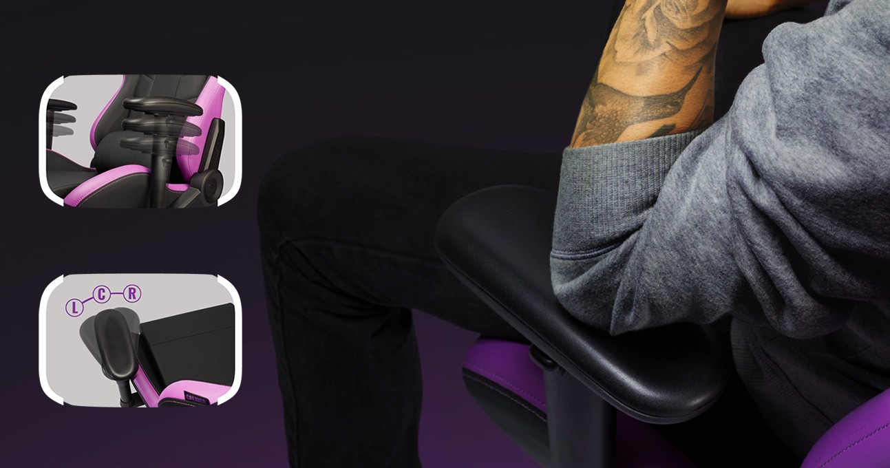 Tư thế ngồi và hỗ trợ từ ghế là yếu tố quan trọng để đi đến một trận thắng sau nhiều giờ đua xe. Caliber R2 Purple sở hữu 2 miếng kê tay mềm có điều chỉnh toàn hướng bao gồm nâng độ cao và xoay vòng.