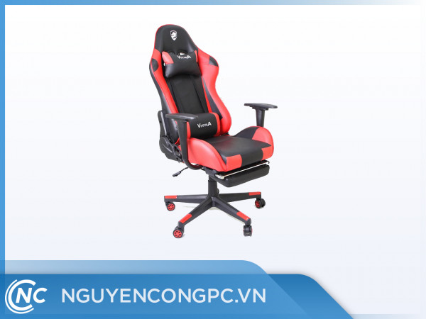GHẾ GAME CAO CẤP VITRA XRACING X100 PLUS BLACK RED (có kê chân) có Chất liệu: Da PU & PVC cao cấp, đệm đúc - Khung thép chịu lực 1.2mm - Kê tay: Yes - Chế độ ngả lưng: 180o - Trục thủy lực class 3 - Kê chân - Yes - Khung chân nylon base, bánh xe lớn, chịu lực tối đa 180Kg - Phụ kiện kèm theo: Đệm lưng, đệm cổ