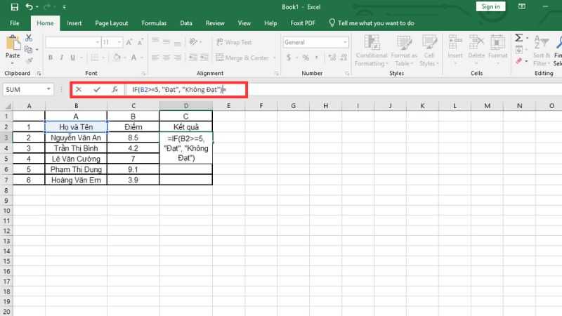 Tại ô C2, bạn sẽ nhập công thức sau: =IF(B2>=5, "Đạt", "Không Đạt")