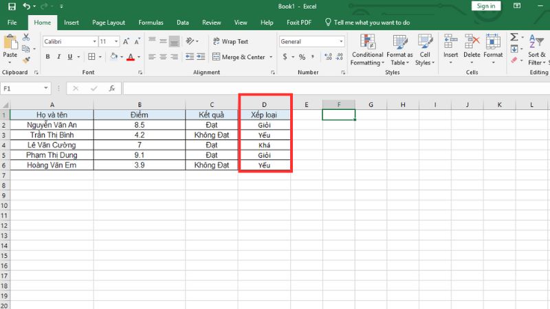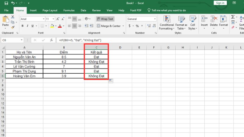 Sau đó, bạn có thể kéo công thức này xuống cho các học sinh còn lại. Excel sẽ tự động kiểm tra điểm của từng học sinh và điền kết quả tương ứng.