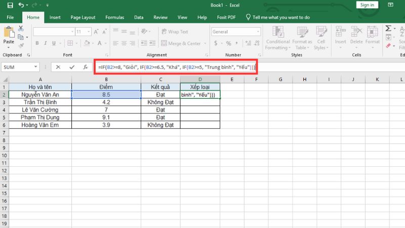 Công thức sẽ như sau: =IF(B2>=8, "Giỏi", IF(B2>=6.5, "Khá", IF(B2>=5, "Trung bình", "Yếu")))