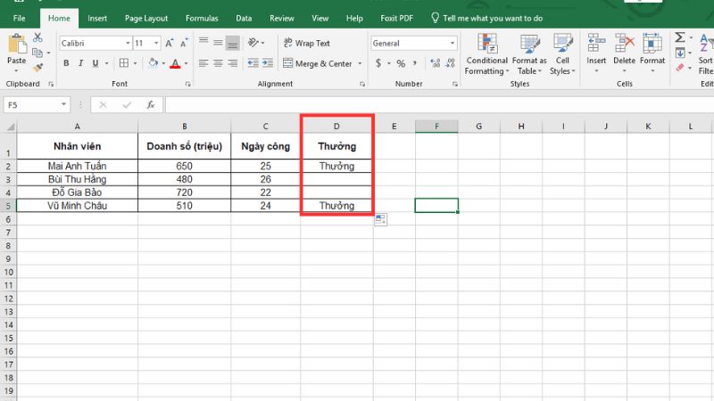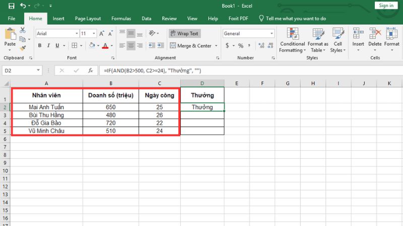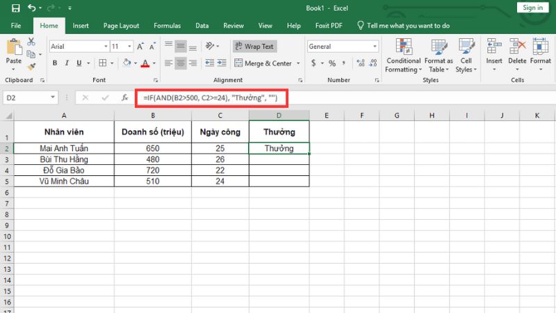 Giả sử bạn muốn thưởng cho nhân viên nếu họ đạt được Doanh số > 500 triệu VÀ Số ngày làm việc >= 24.