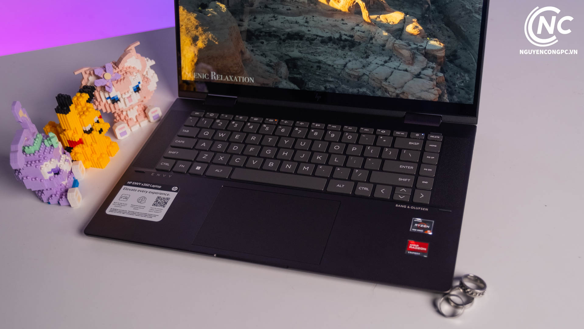 HP Envy X360 15-FH0013DX 15 Ryzen 5 sở hữu bàn phím kiểu chiclet cùng các phím cách đều nhau, độ nảy cực tốt và hành trình phím vừa phải. HP đã tích hợp thêm một vài phím tắt hữu ích vào hàng phím chức năng, bao gồm nút tắt tiếng micrô và công tắc tắt webcam cùng với bàn di chuột khá lớn hỗ trợ điều hướng đa điểm tốt, tracking mặt phủ kính mượt mà, chính xác.