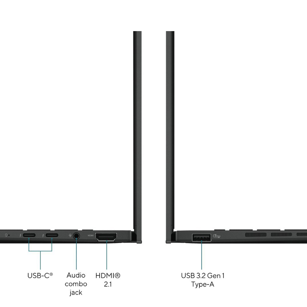 Laptop Asus Zenbook 14 OLED Q415 hỗ trợ hầu hết các cổng kết nối hiện đại phổ biến hiện nay, bao gồm: 1 cổng USB 3.2 Gen 1 Type-A, 2 cổng Thunderbolt™ 4 hỗ trợ xuất hình và sạc, 1 cổng HDMI 2.1 TMDS và 1 cổng combo âm thanh 3.5mm.