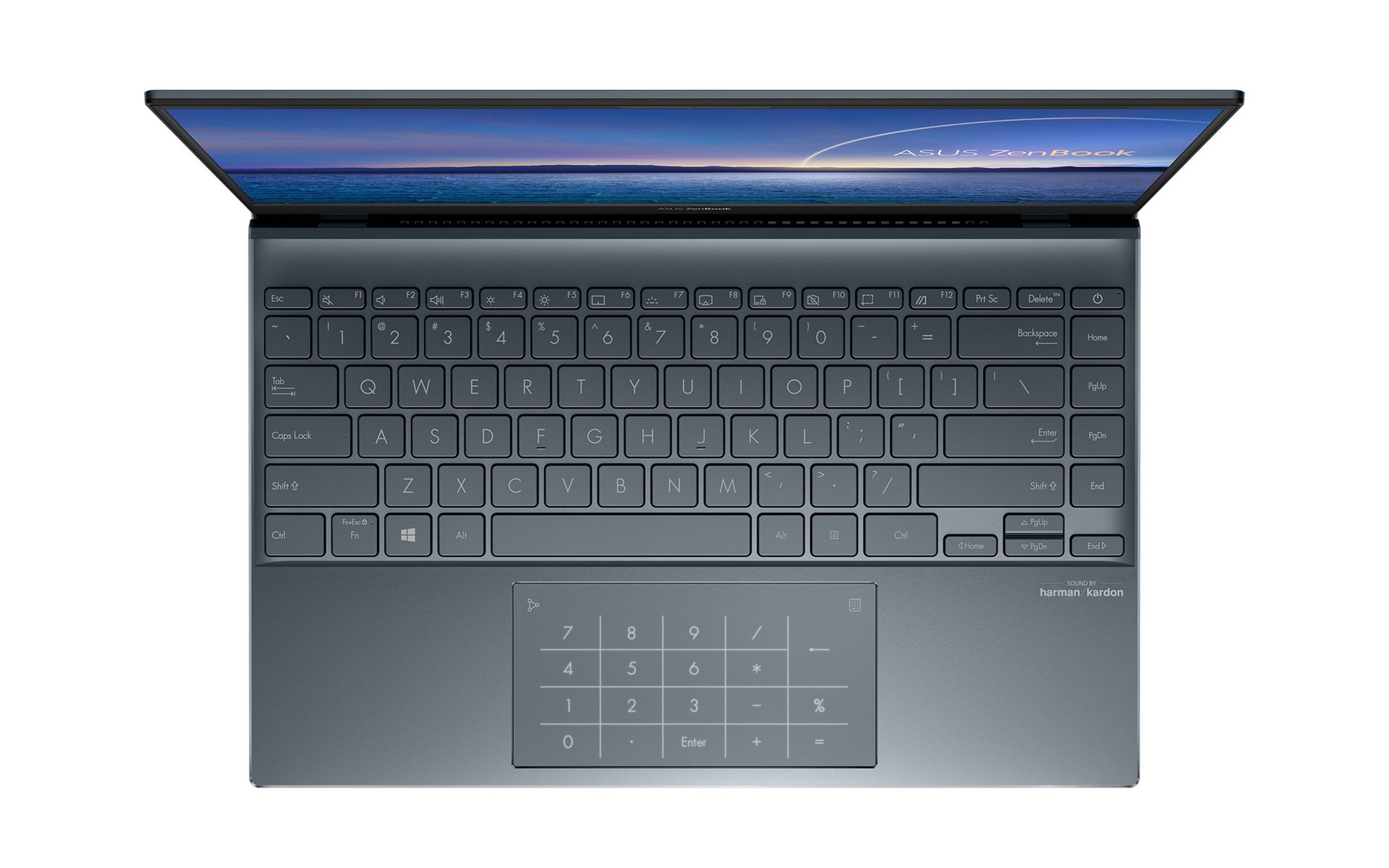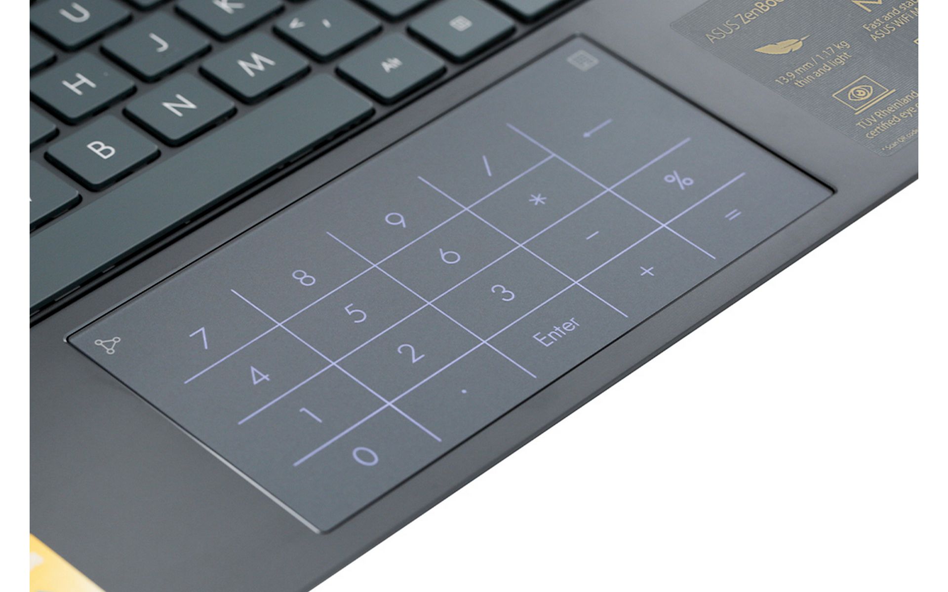 ZenBook 14 được trang bị sẵn ASUS NumberPad 2.0 đột phá, bàn di chuột chức năng kép với vùng phím số ảo được chiếu sáng bằng đèn LED tích hợp. Kể cả khi bật NumberPad, bàn di chuột vẫn có thể được dùng để điều khiển con trỏ nhờ phần mềm thông minh.