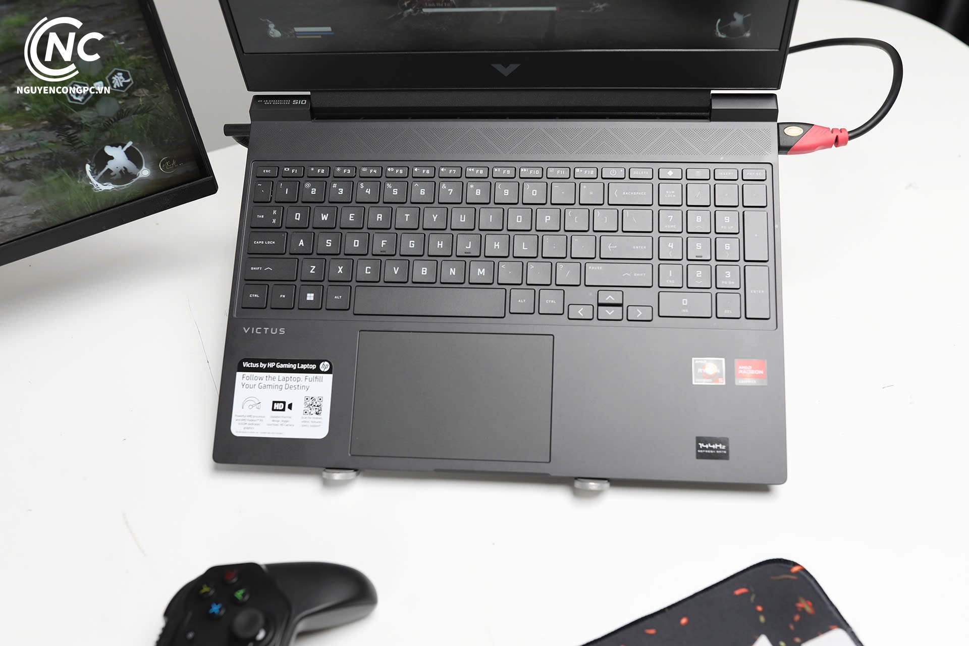 Khác với dòng Omen, HP Victus 15 2023 được trang bị bàn phím đầy đủ với cả số và chữ, mang lại sự tiện lợi cho nhiều mục đích sử dụng từ gõ văn bản đến chơi game. Trải nghiệm gõ trên bàn phím này khá tốt với hành trình phím vừa đủ và độ phản hồi khá ổn. Tuy nhiên, đèn nền của bàn phím HP Victus 15 chỉ có một màu đơn sắc thay vì LED RGB như những sản phẩm gaming khác. Điều này có thể làm giảm phần nào tính thẩm mỹ, nhưng độ sáng của đèn nền vẫn đủ để sử dụng dễ dàng.